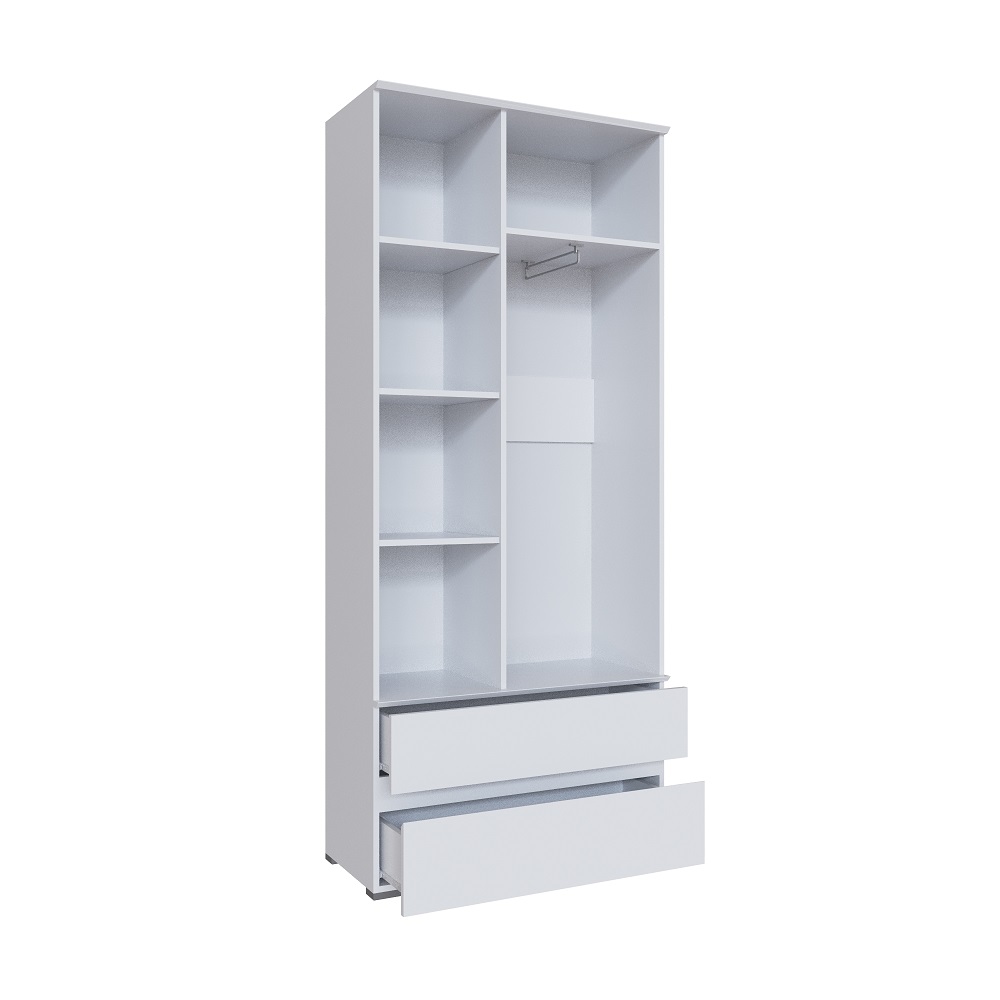 В поисках внместительного шкафа со стандартными габаритами рекомендуем присмотреться к модели из серии Плейона. Двухстворчатый шкаф оснащен выдвижной евроштангой, комплектом полок и двумя выдвижными ящиками.