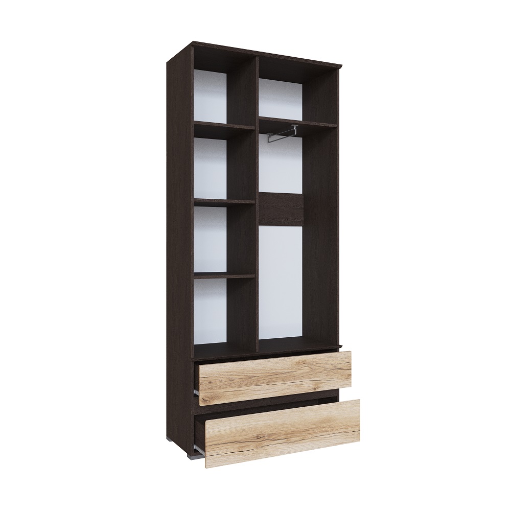 В поисках внместительного шкафа со стандартными габаритами рекомендуем присмотреться к модели из серии Плейона. Двухстворчатый шкаф оснащен выдвижной евроштангой, комплектом полок и двумя выдвижными ящиками.