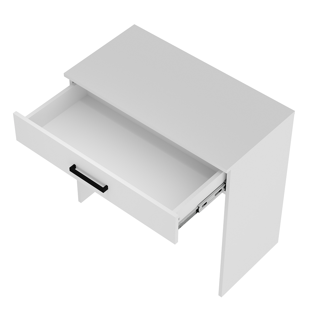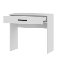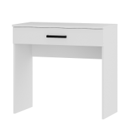 Коллекция мебели для спальни Фьюжн является воплощением эстетики минимализма. Белый цвет в сочетании с черной фурнитурой, строгие линии, простой конструктив – все это лучшие черты мебельного дизайна. Туалетный стол СТ-02 имеет компатные размеры, посему позволит Вам организовать женский уголок даже в небольшой спальне. В выдвижном ящике поместится косметика, аксессуары и другие личные вещи.