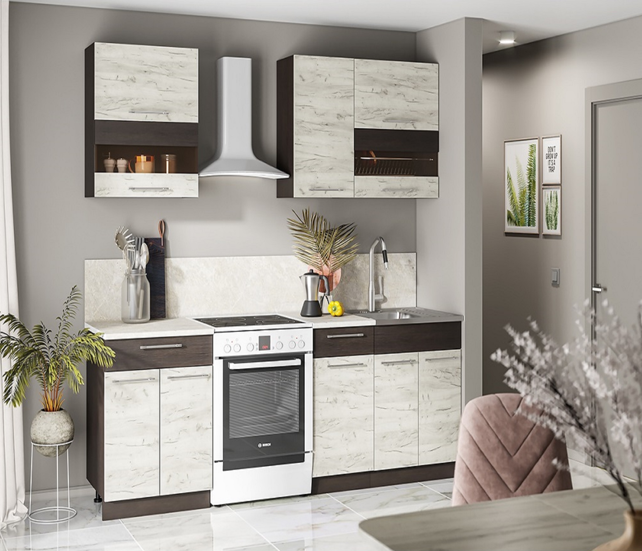 Гарнитур Маша шириной 1.6 м спроектирована для тех хозяек, которые мечтают готовить на удобной и стильной кухне. Верхние модули: ШВ 600, ШВ 600, ШВ 400 - (ВхГ) 71.5х30 см. Нижние модули: ШНМ 600, ШН1Я 600, ШН1Я 400 - (ВхГ) 84.5х52 см (высота указана с учётом столешницы). Декор столешницы - Антарес 26 м.
