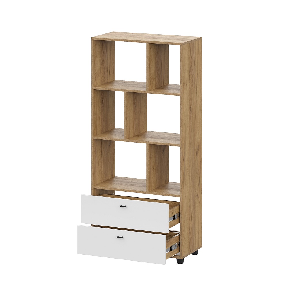Сочетание открытых полок для книг и предметов декора и выдвижных ящиков - главный секрет функциональности стеллажа.