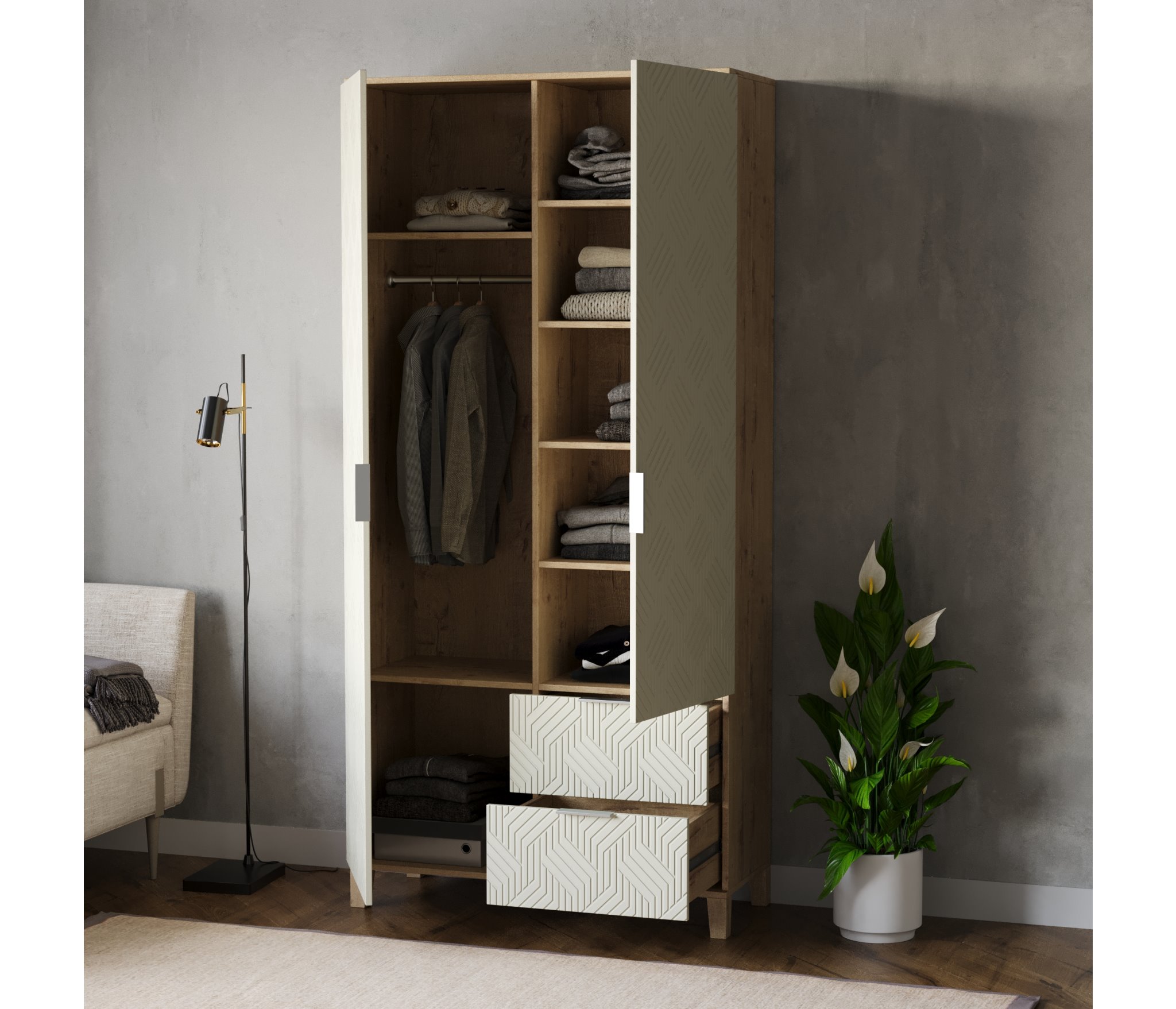 Шкафы Марвин, выполненные в скандинавском стиле, органично дополнят интерьер любой комнаты. Ножки из массива бука, геометрическая фрезеровка на фасадах, сочетание цветов отличительная черта серии Шкафов Марвин.