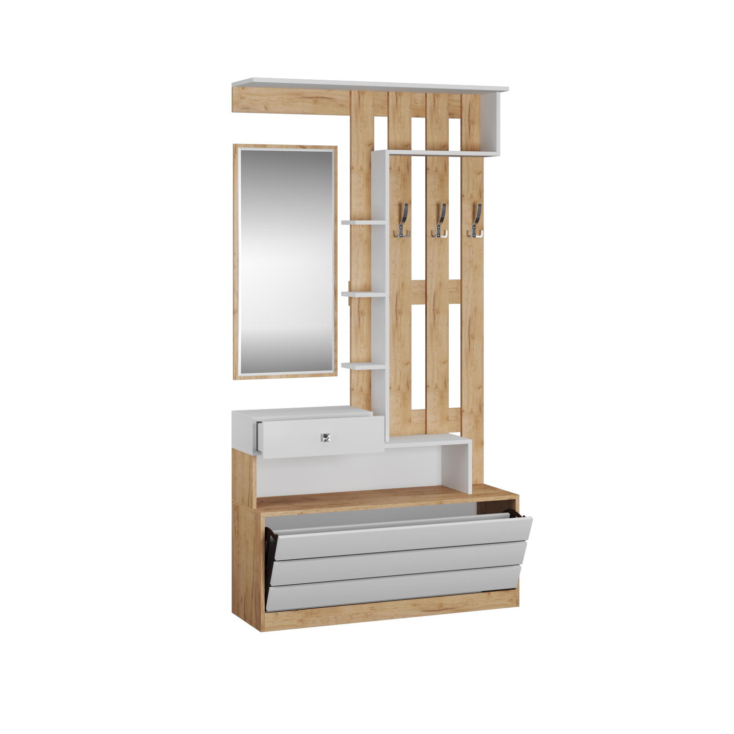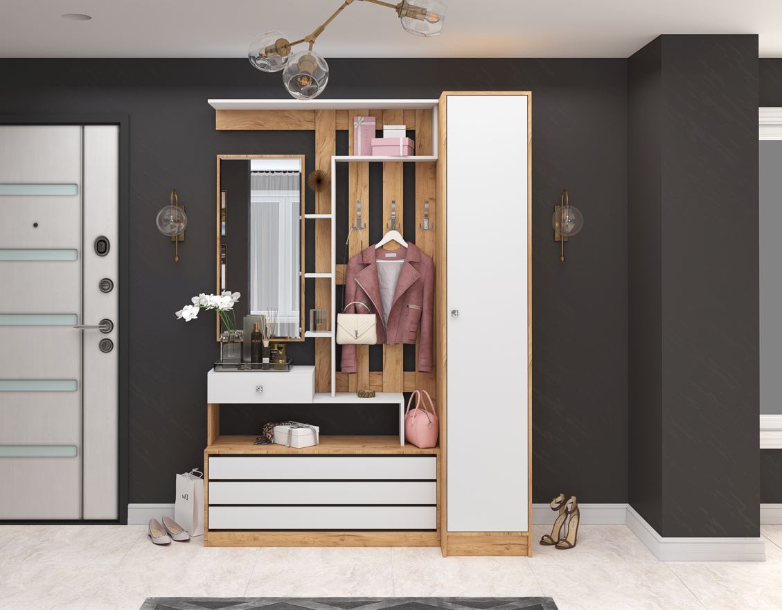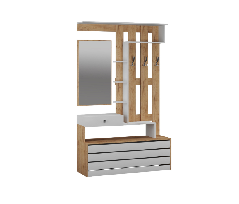 Модуль уникален по своей функциональности и содержит нишу для обуви с откидной дверцей, выдвижной ящик для мелочей, открытую вешалку с 3-мя крючками, полку-антресоль, набор открытых полок и зеркало.