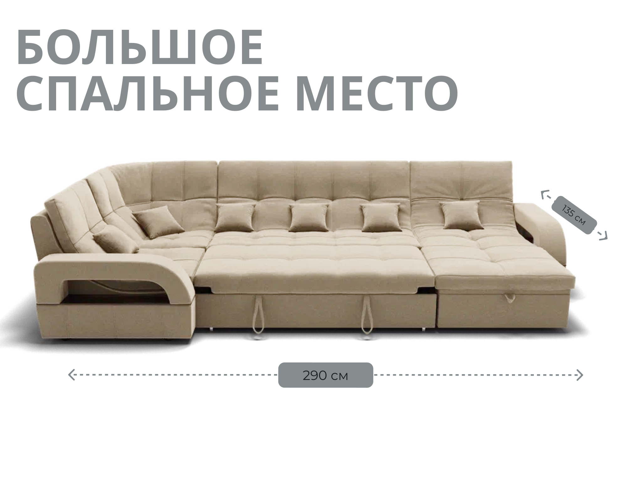 Спальное место имеет ширину 135 см и длину 290 см. Он предназначен для двух человек и имеет глубину сиденья 65 см. Максимальная нагрузка на диван составляет 280 кг.