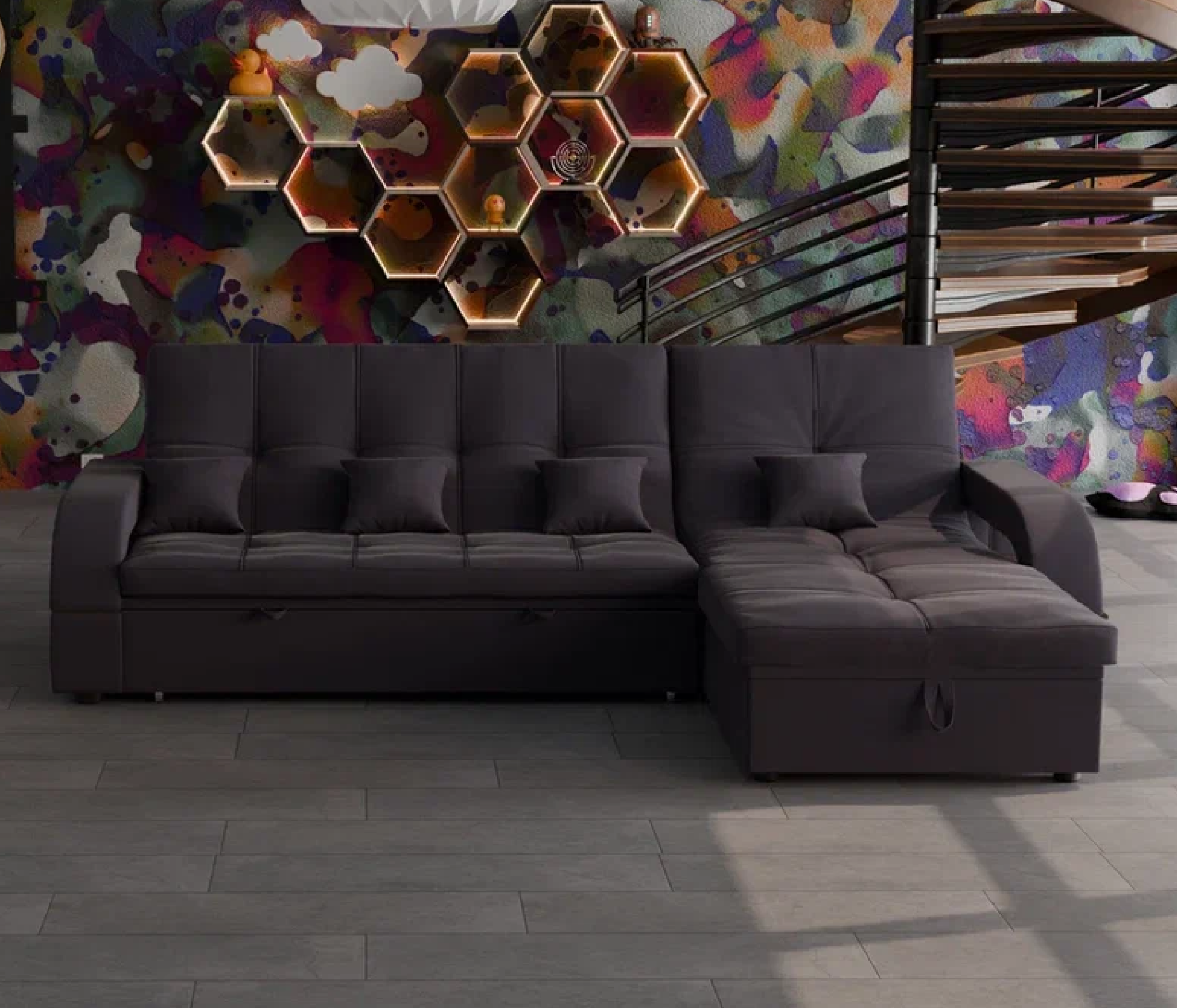 Он имеет высоту 97 см, ширину 268 см и глубину 175 см. Диван обладает универсальным расположением угла, что позволяет его использовать в любом помещении.