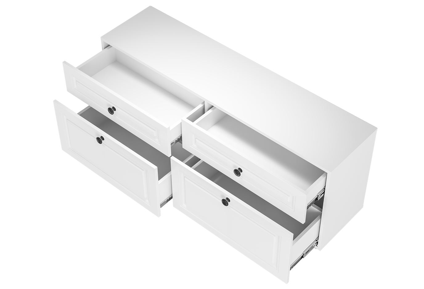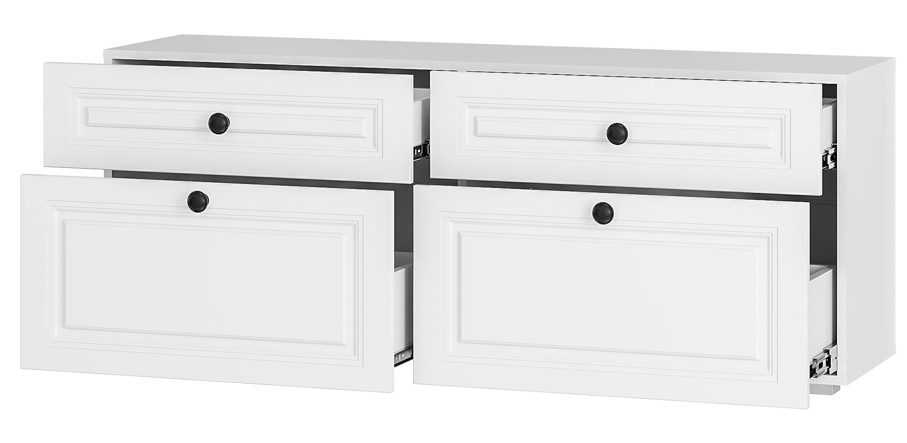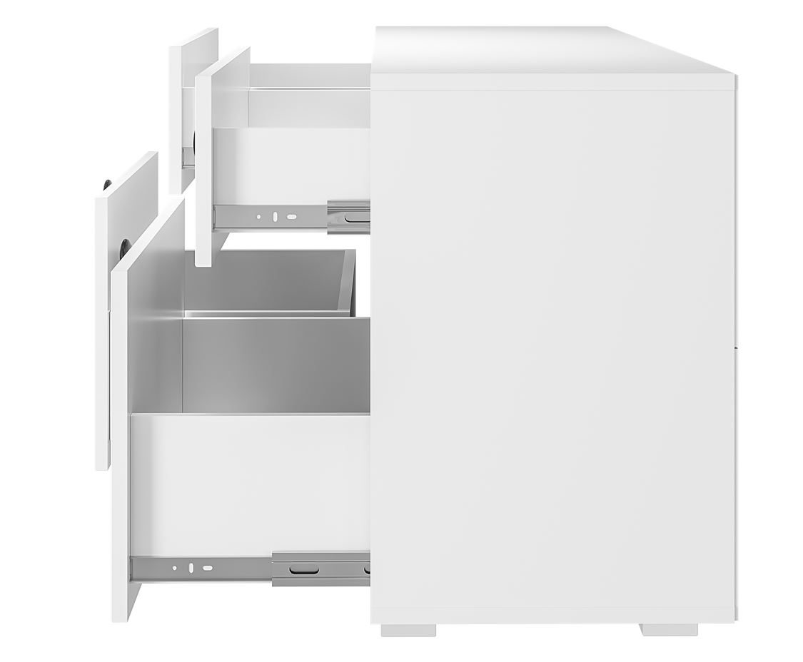 Изюминку белому цвету корпуса добавляют фрезеровка на фасадах и минималистичные металлические ручки черного цвета.