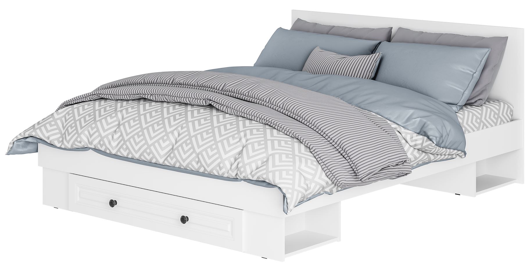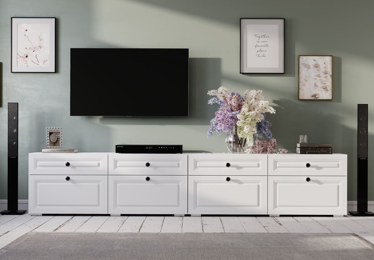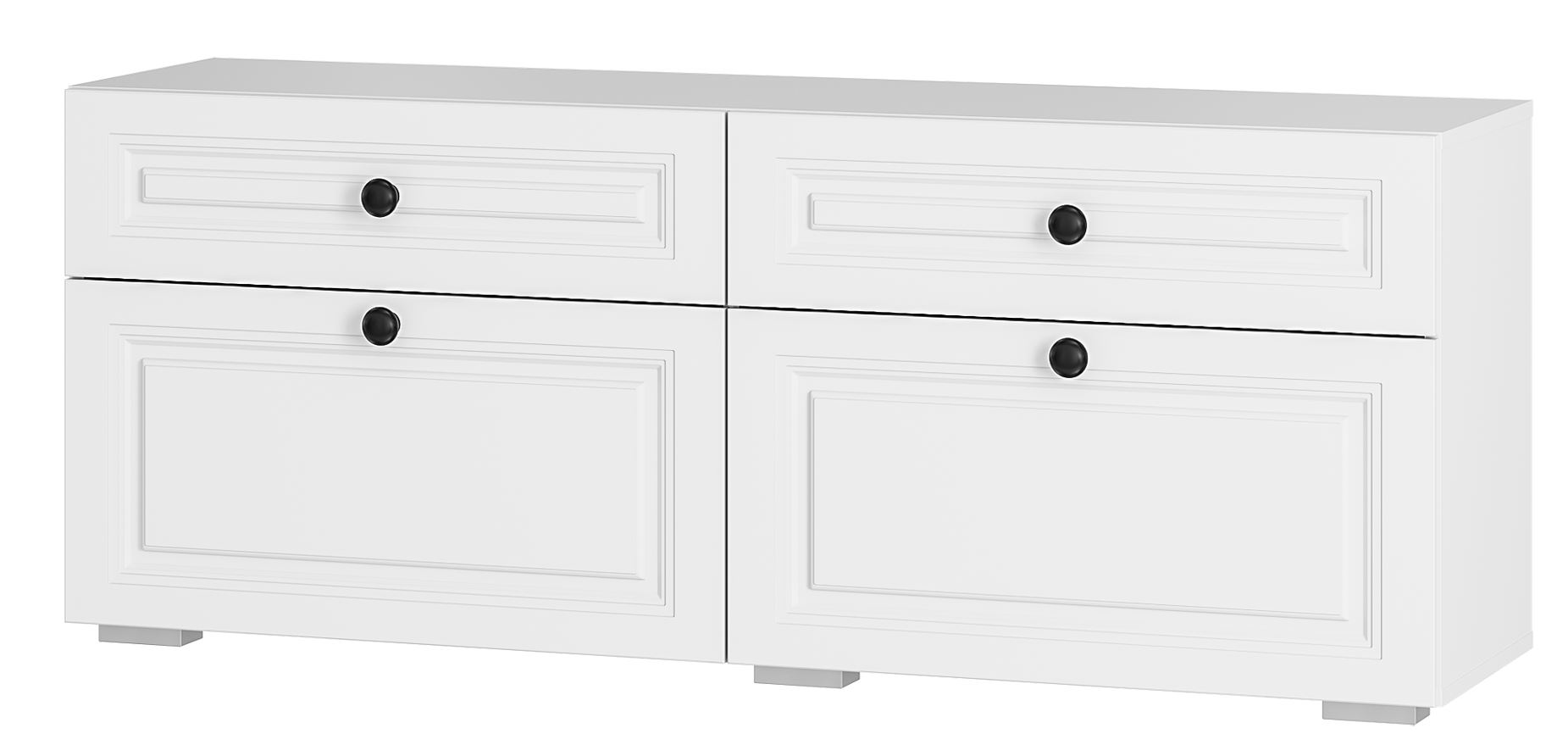 Изюминку белому цвету корпуса добавляют фрезеровка на фасадах и минималистичные металлические ручки черного цвета.