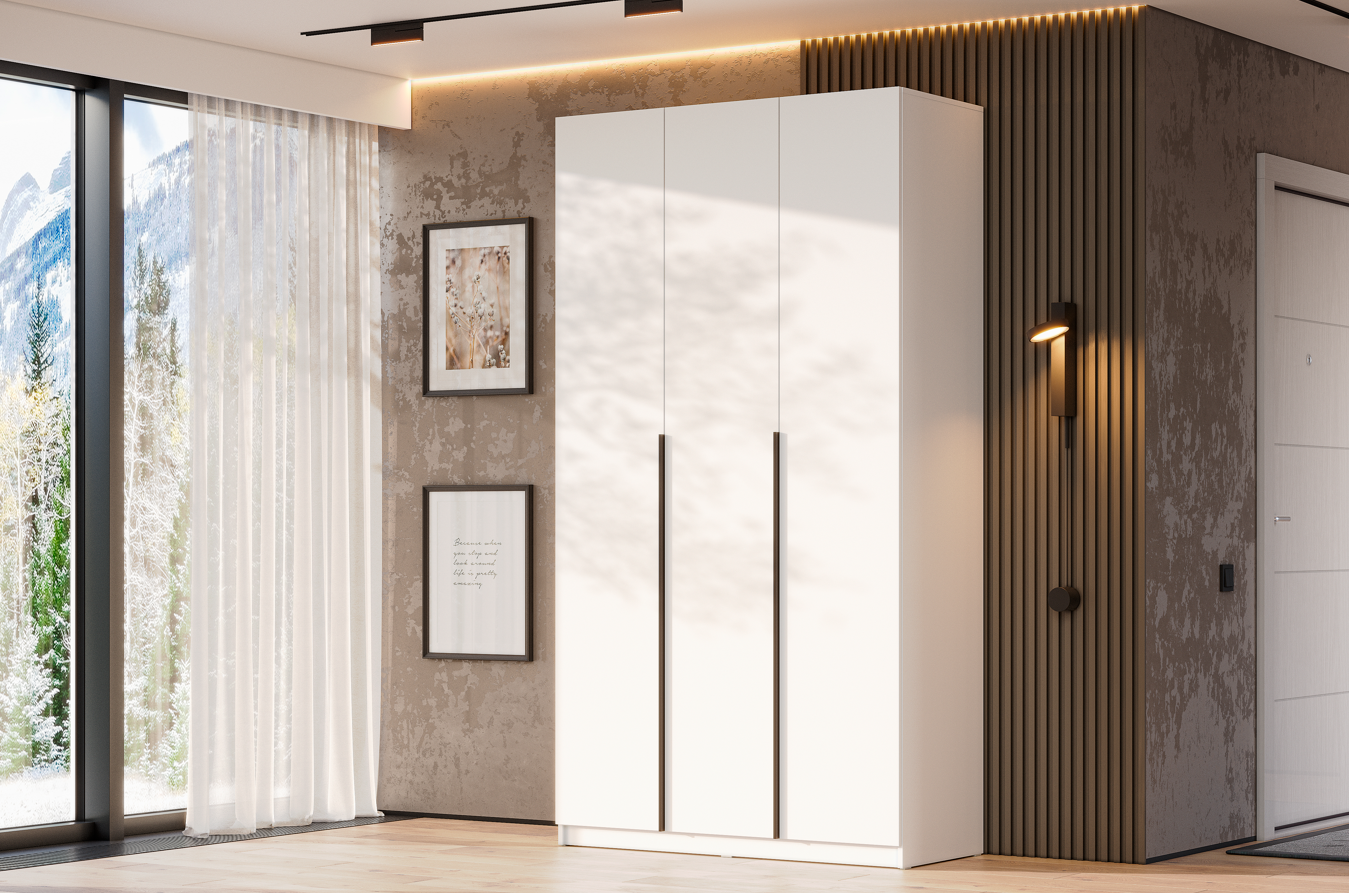 Аккуратный и современный дизайн Шкафа распашного ШК 5-1200, белое дерево дополнит спальню или прихожую. Внутреннее наполнение - вместительные полки для белья, антресоль для хранения аксессуаров с большим отсеком и вешалкой-штангой.