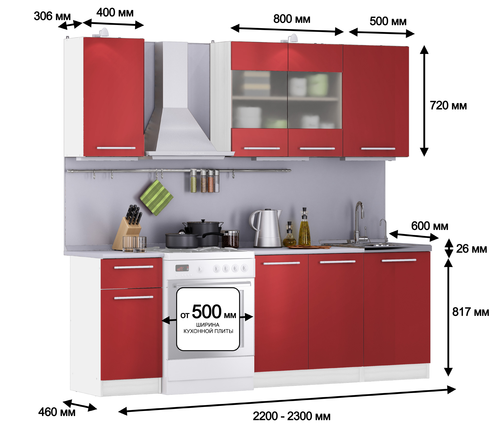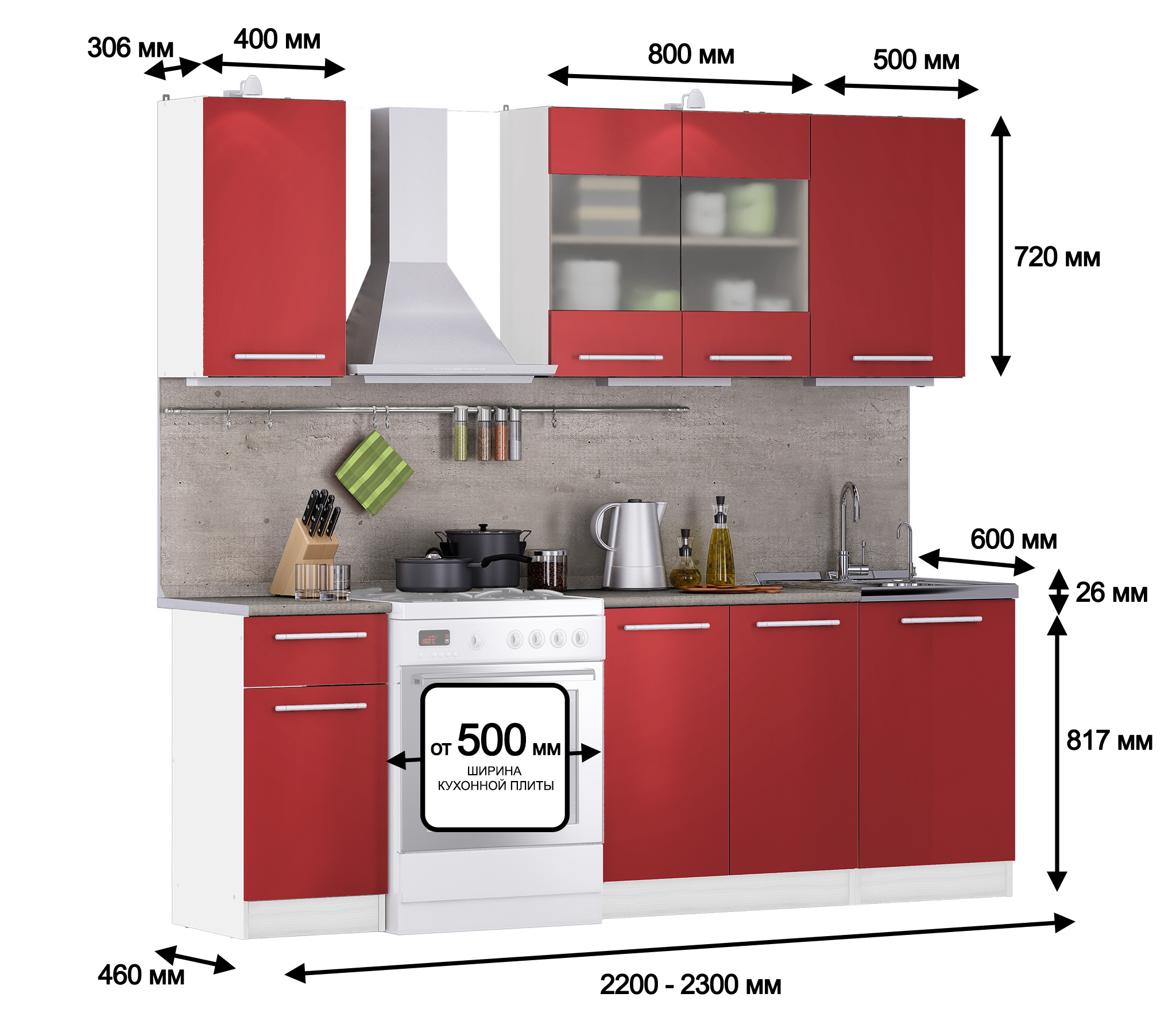 Глубина нижних шкафов без учета столешницы - 46 см.