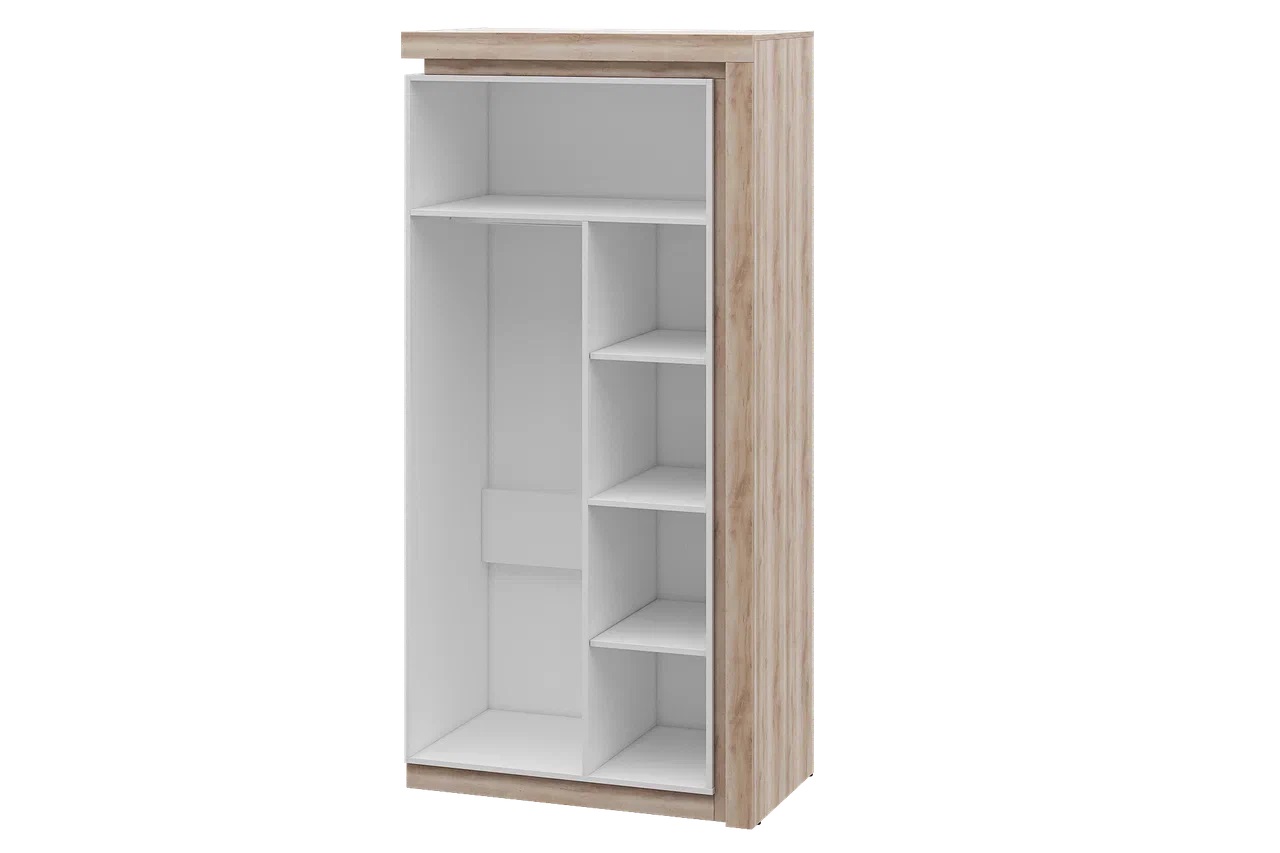 Корпус шкафа выполнен из ЛДСП толщиной 16 мм в цвете «дуб сакраменто», а фасад — из МДФ толщиной 16 мм в цвете «белый снег глянец». Металлические ручки имеют светлый сатиновый оттенок, что придаёт шкафу элегантность и современность. Разноплановое наполнение и универсальная сборка делают этот шкаф идеальным выбором для детской комнаты.