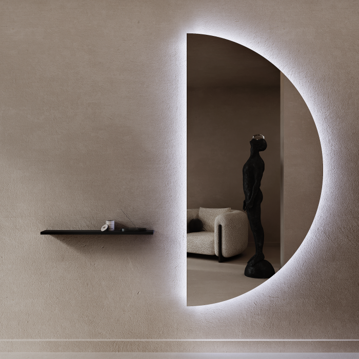 Безрамное зеркало в форме полукруга с контурной (тыльной) подсветкой, свет 3000К. Подложка из высококачественного МДФ, светодиодная лента защищена матовым свето-рассеивателем от попадания пыли и влаги. Есть вывод 220W для подключения к сети (блок питания подсветки 12V), включение подсветки от выключателя на стене, либо от розетки.