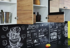 Готовое решение "Крафт" представлено корпусом в белом исполнении. Верхние стеклостворки фасадов украшены прозрачным стеклом в черной декоративной рамке, нанесенной при помощи фотопечати.