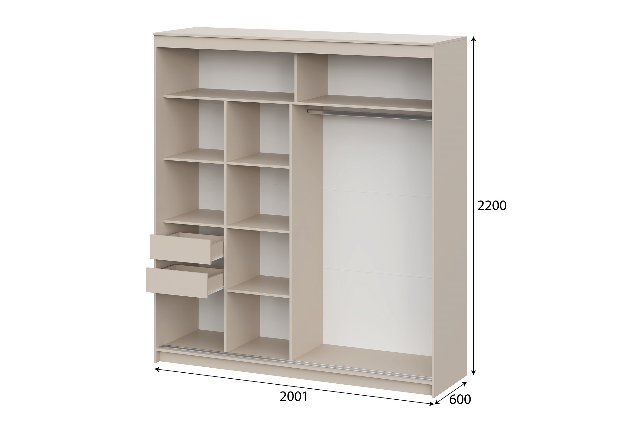 Внутреннее наполнение шкафа включает удобные полки и два выдвижных ящика с одной стороны, а также вместительную платяную секцию с надёжной металлической штангой для одежных вешалок за другой створкой. Нижнеопорная система раздвижных створок обеспечивает лёгкое и ровное открытие.