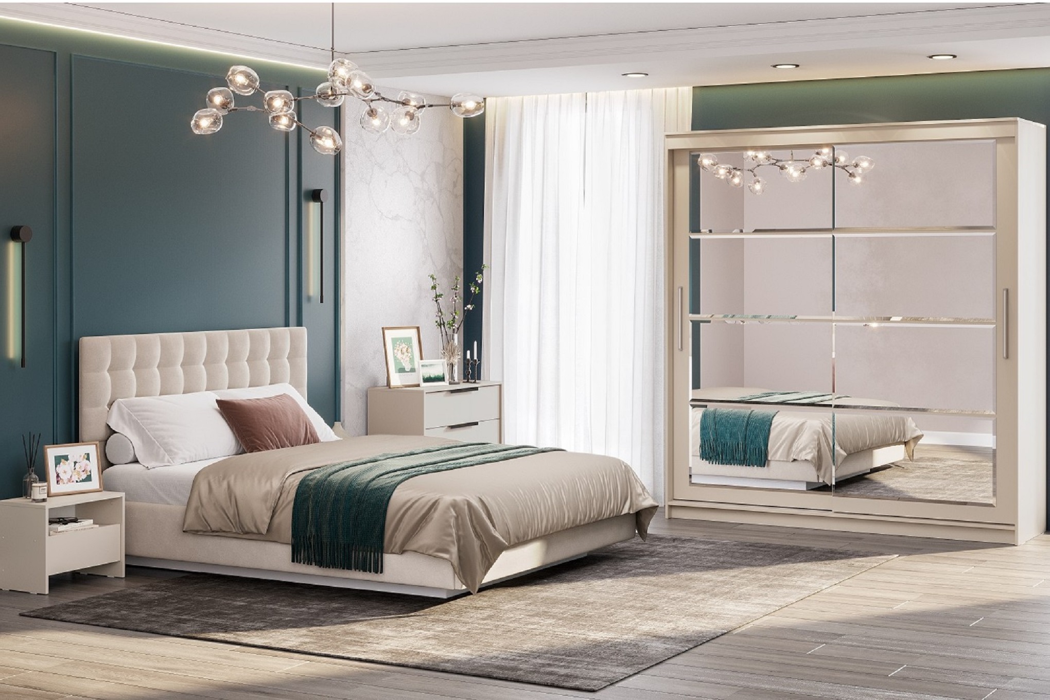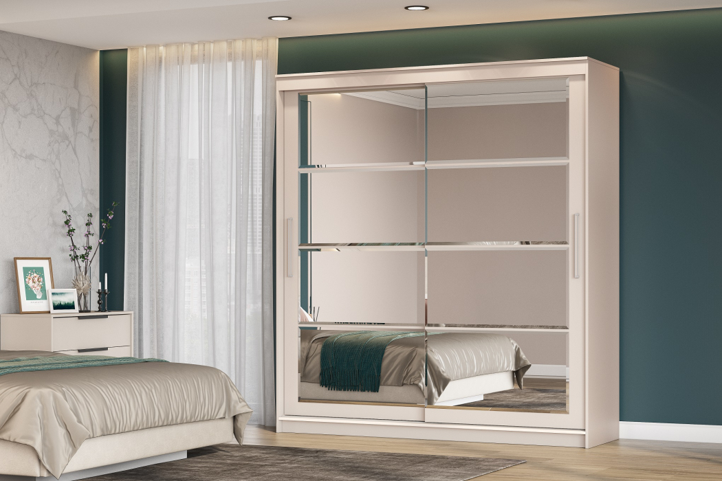 Шкаф-купе №3 — это вместительный и эргономичный шкаф, который станет удобным местом для хранения вещей и стильным элементом интерьера гостиной или спальной комнаты. Его светлые фасады, укрытые стеклом, и огромная зеркальная панель с фацетом визуально расширяют пространство, легко сливаясь в композицию с окружающей мебелью.