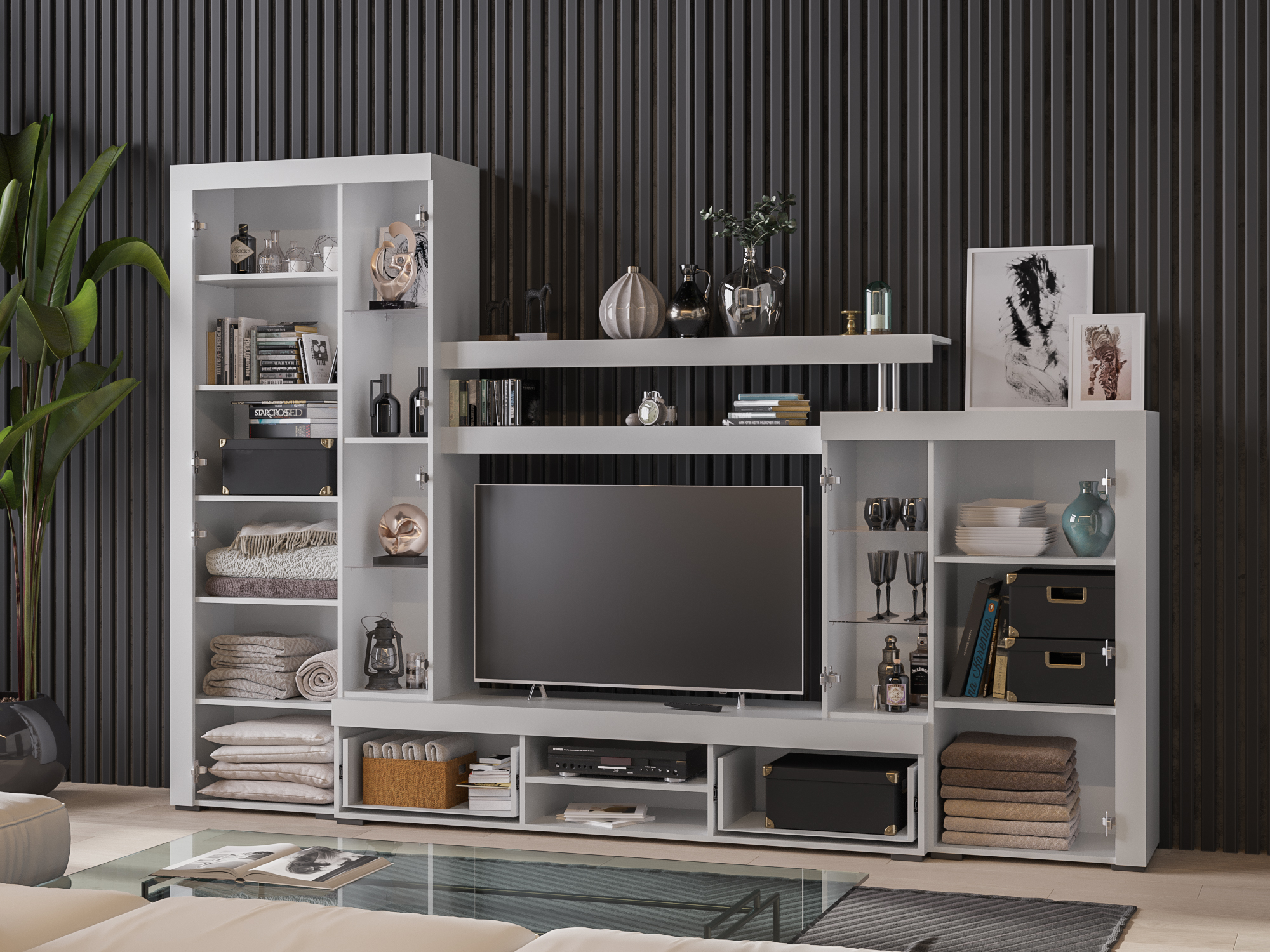 Гарнитур включает широкий платяной шкаф с тремя отсеками, большую подвесную полку, пять ящиков с дверцами и множество небольших полочек. Открытые полки можно использовать под сувениры и фотографии, а застекленные витрины позволят в выгодном ракурсе представить красивую посуду и оригинальные аксессуары.