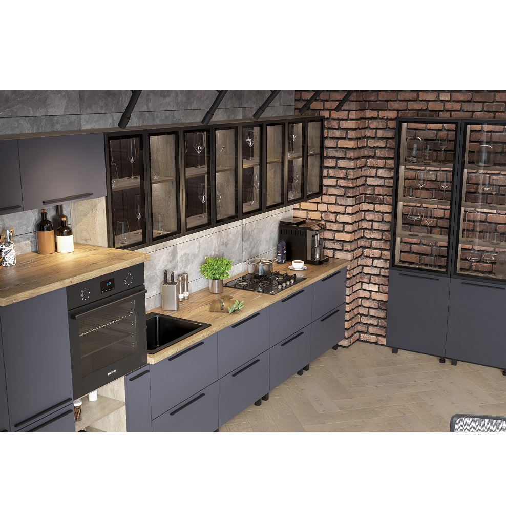 Модульная кухня Этна Софт Графит выполнена в современном стиле и сочетает в себе глубокий темно-серый оттенок фасадов и древесный декор корпуса. Актуальное исполнение, продуманное наполнение шкафов, фурнитура европейского качества и возможность создать уникальный комплект.