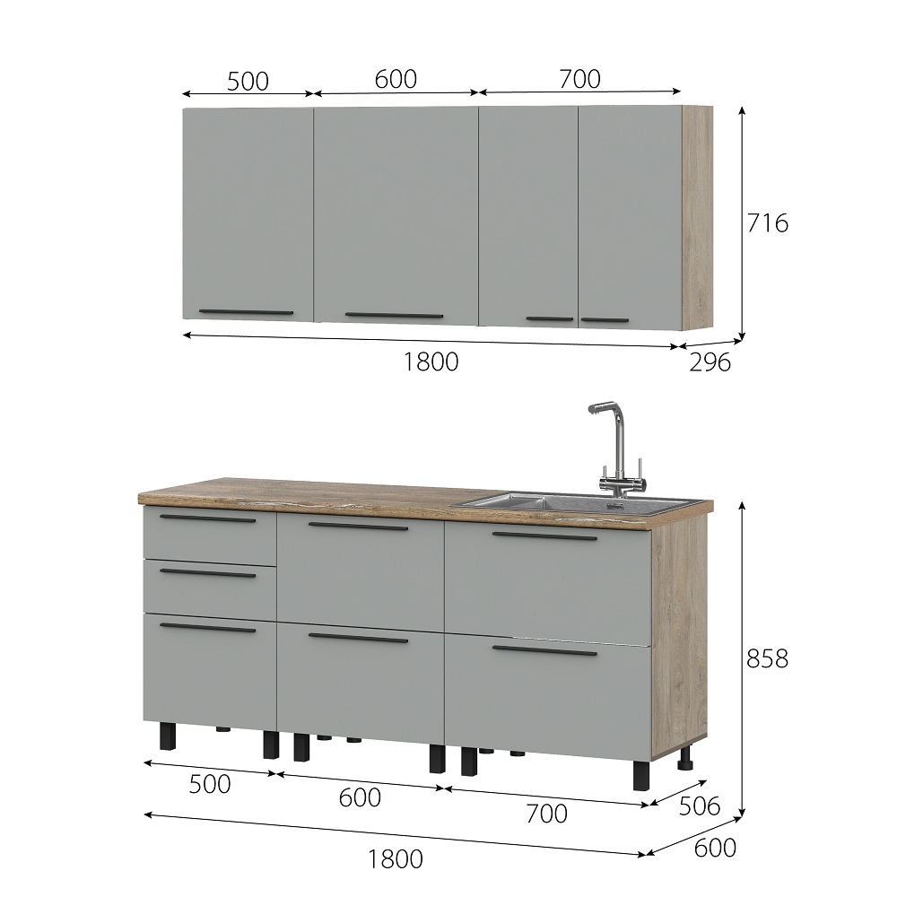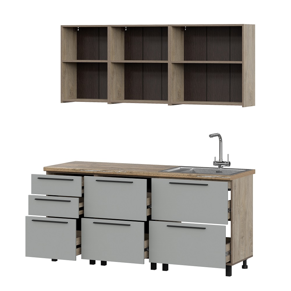 Модульная кухня Этна Софт Грей выполнена в самом трендовом декоре этого года – выбеленном нежно-сером оттенке с пудровой текстурой Soft. Такой декор фасадов гармонично дополняет корпус с древесным рисунком эндгрей необработанный.