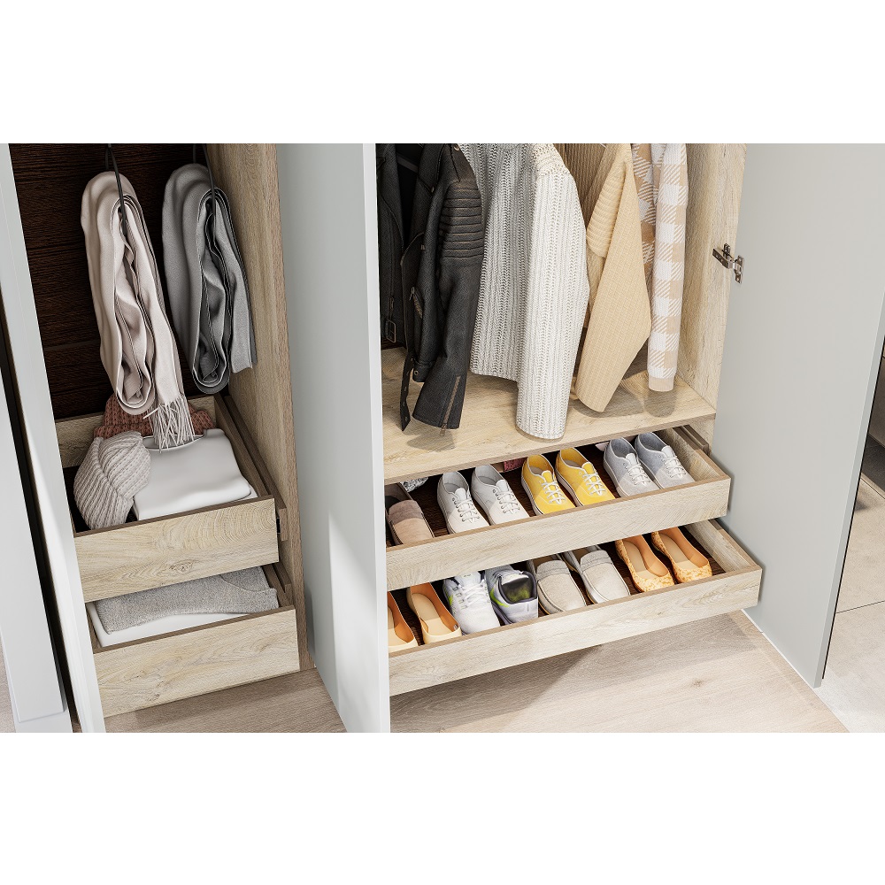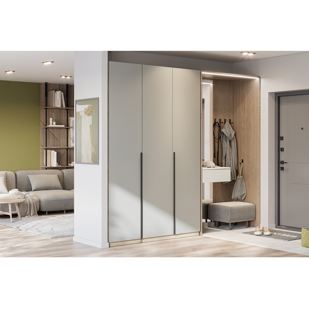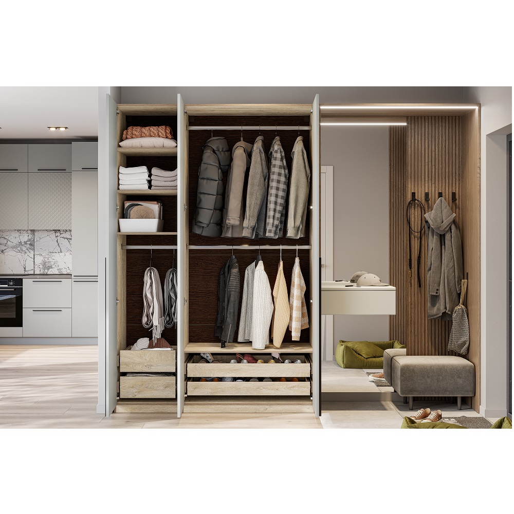 Гардеробная система Этна – это уникальная серия, включающая корпуса, распашные фасады и разнообразное наполнение (ящики, полки, штанги, выкатные брючницы). Вы сможете организовать продуманное хранение одежды и вещей в любом помещении, от прихожей до рабочего кабинета, с учетом его размера и Ваших запросов. Трендовый декор фасадов «софт грей» гармонично дополняет сложный древесный декор корпуса «дуб эндгрей».