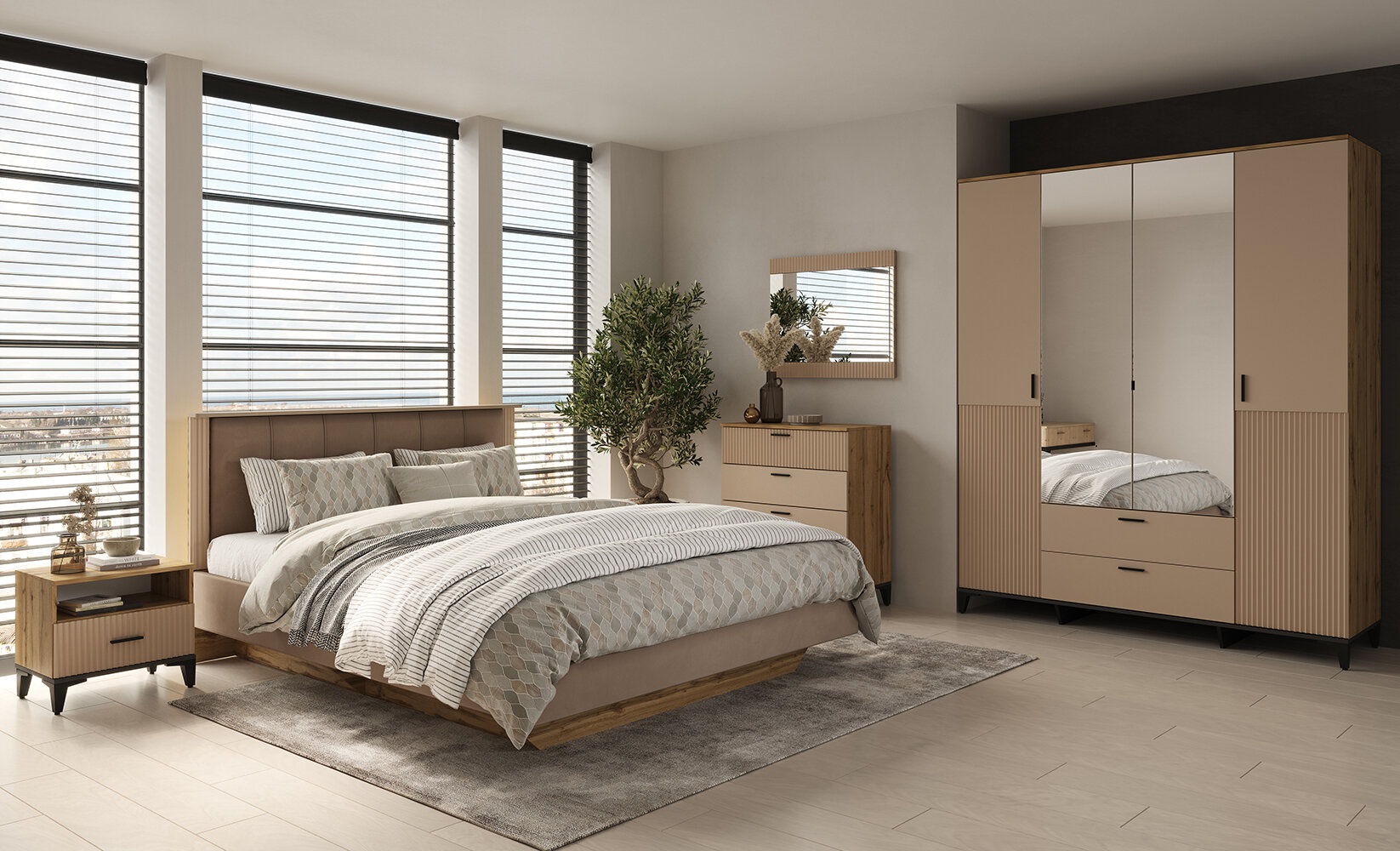 Модульная коллекция Дюна поможет создать изысканный и уютный интерьер для вашей спальни. Каркасы в древесном декоре эффектно сочетаются с фрезерованными фасадами кофейного оттенка.