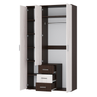Шкаф трёхстворчатый Белла в цвете венге/ясень белый — это стильное и функциональное решение для хранения вещей. Он оснащён тремя ящиками и зеркальной дверью, а также металлической перекладиной и полками для одежды.