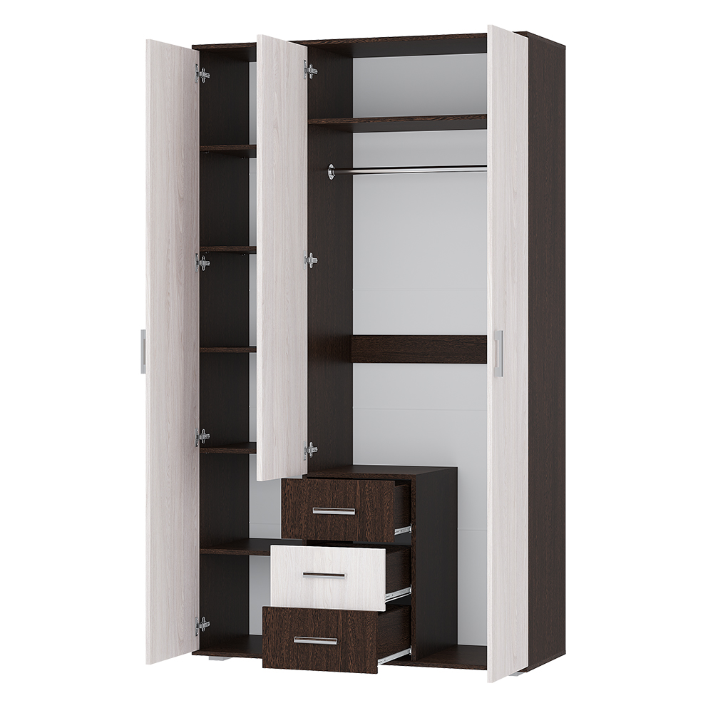 Шкаф трехдверный Белла имеет 3 ящика, зеркальную дверь. Шкаф оснащен металлической штангой и отсеком с полками для одежды.