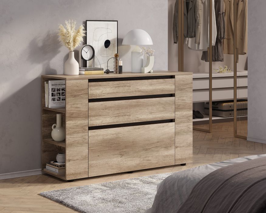 Многофункциональный комод «Энигма» отлично дополнит интерьер спальни или гостиной. В глубоких выдвижных ящиках удобно хранить постельные принадлежности, белье и одежду. На боковых встроенных полках можно разместить мелочи, которые всегда должны быть под рукой.