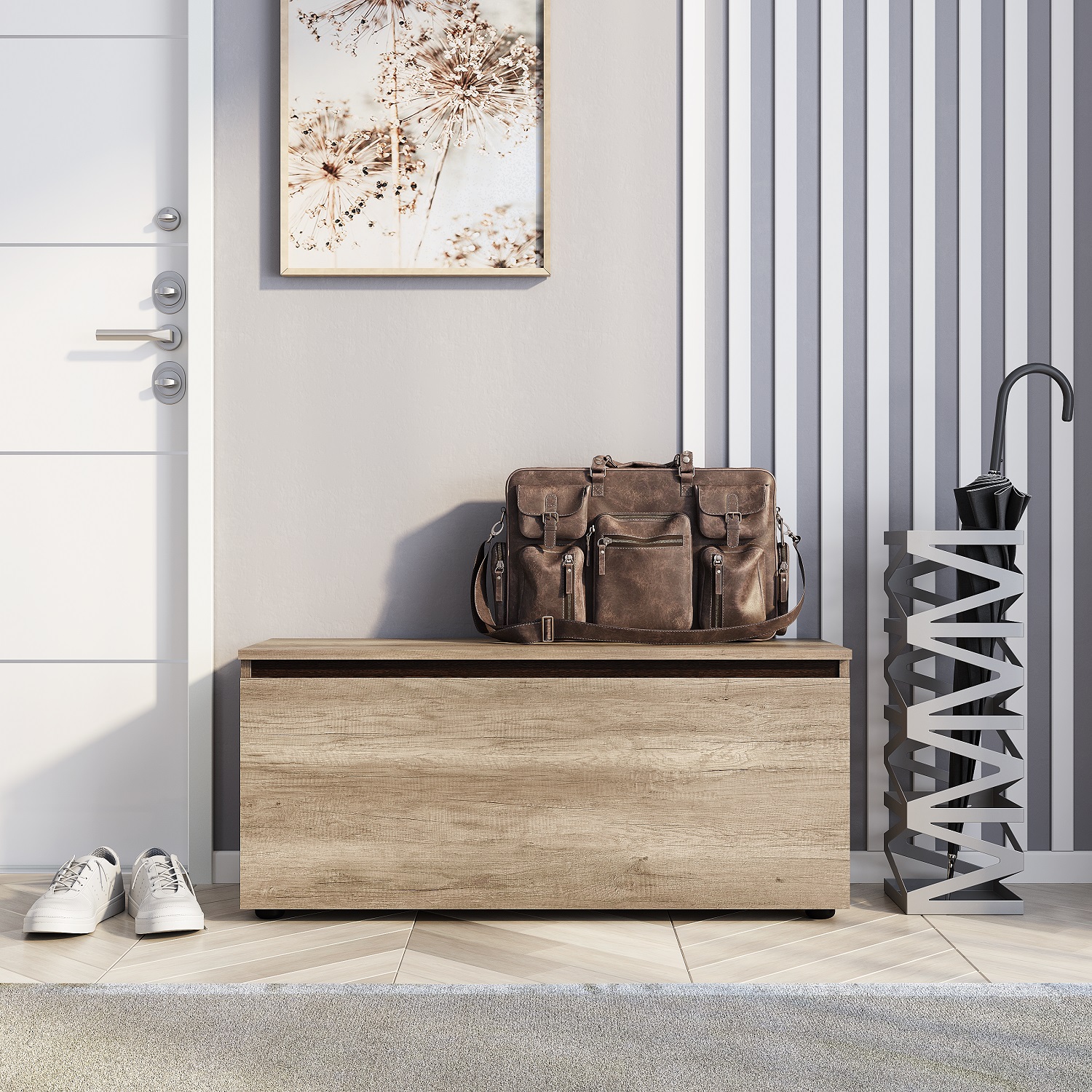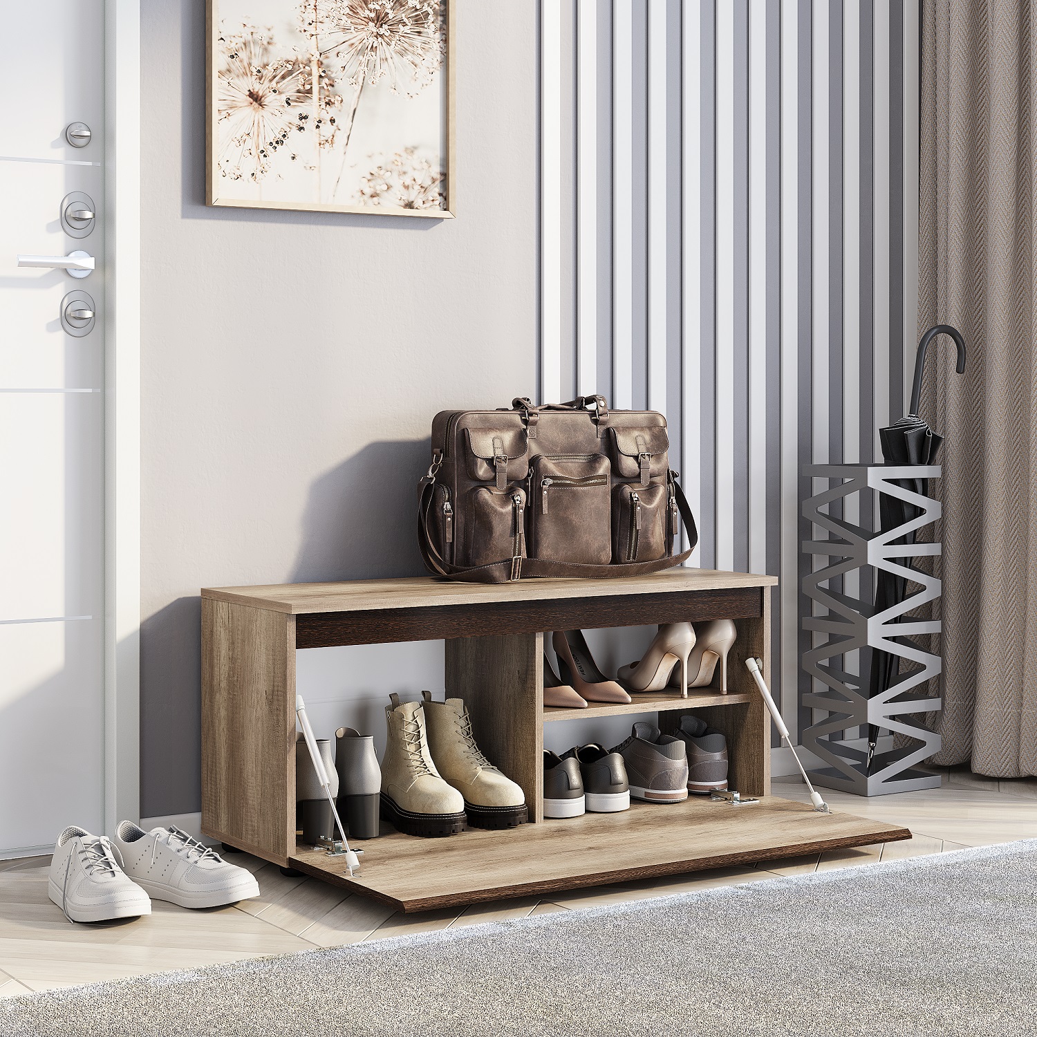 Тумба «Энигма» — лаконичное и функциональное решение для спальни. Пространство за откидной дверцей разделено на два отсека: одну большую и две компактных полки. Модель также подойдёт для гостиной или домашнего офиса.