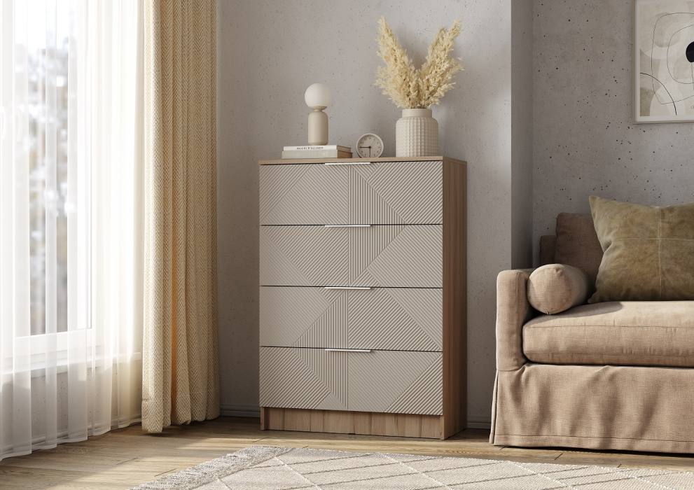 Компактный комод Эмилия с выкатными ящиками украсит ваш дом. Лаконичные модели из данной серии украшены изысканной фрезеровкой, а приглушенная цветовая гамма легко впишется в современный интерьер. Разнообразие модулей позволит подобрать идеальный комплект для вашей гостиной.