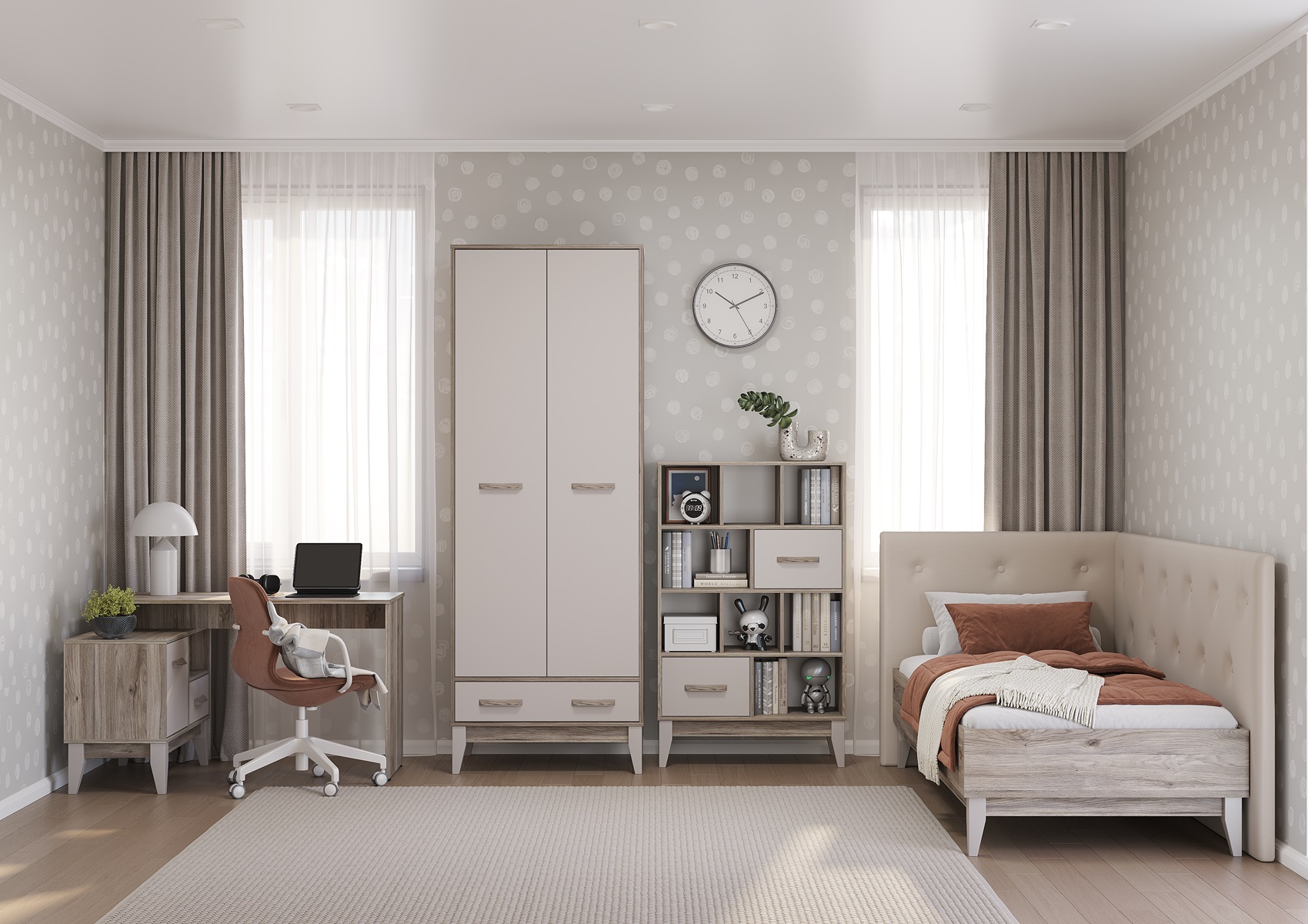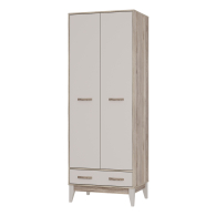 Двухстворчатый шкаф Скандика состоит из нижнего выкатного ящика, двух распашных дверок, за которыми находится отделения с хромированной штангой, вместительная верхняя полка и встроенный блок с двумя дополнительными полками. Ручки повторяют текстуру корпуса «дуб смоки», а створки плотно фиксируются на магнитах.