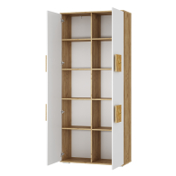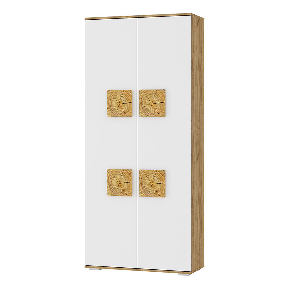 Вместительный распашной шкаф из модульной серии Тиволи. Лаконичный дизайн украшают оригинальные ручки, имитирующие спил дерева. За распашными дверьми Вы найдете множество полок, которые помогут организовать место хранения.