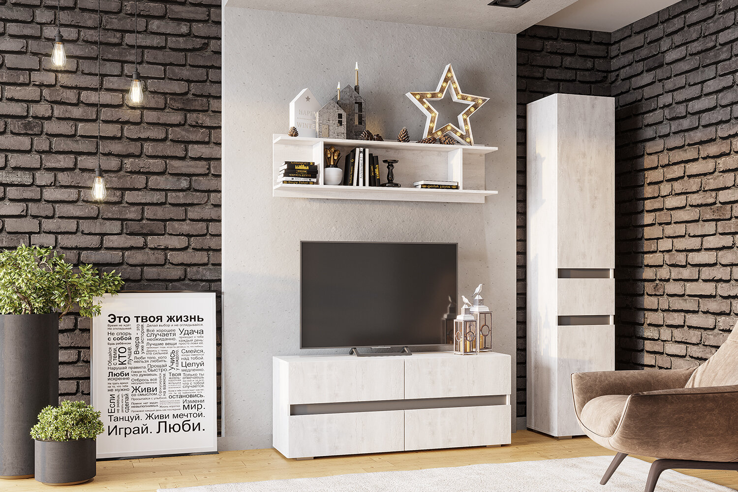 Современная компактная гостиная Мрия выполнена в трендовом цвете Бетон пайн светлый. Серия состоит из самого необходимого: тумба под ТВ, вместительные пеналы и открытая навесная полка, и позволит не загромождать комнату мебелью, а эффективно использовать пространство.