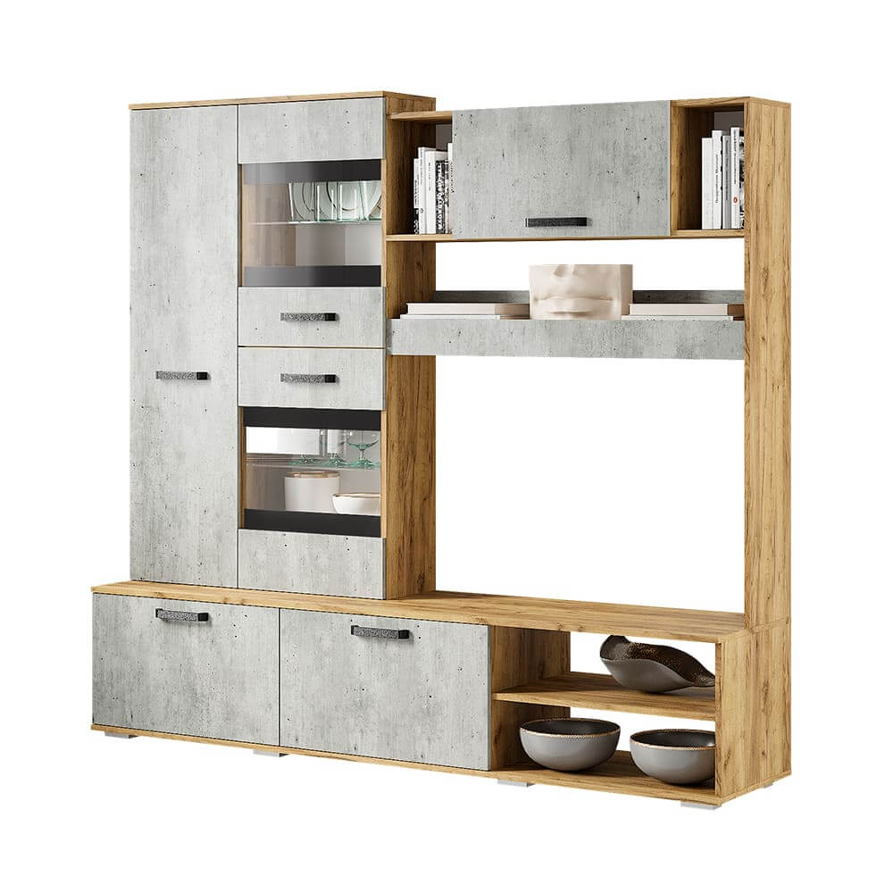 Оформить современную гостиную можно с помощью гарнитура Трамп. Изделие выполнено в стиле одноименной модульной серии, высококачественное ЛДСП цвета крафт сочетается с фасадами, эмитирующими бетонную поверхность,