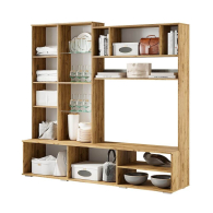 гостиная наполнена закрытыми нишами и открытыми полками, а также несколькими зонами со стеклянными дверцами, что облегчает конструкцию.