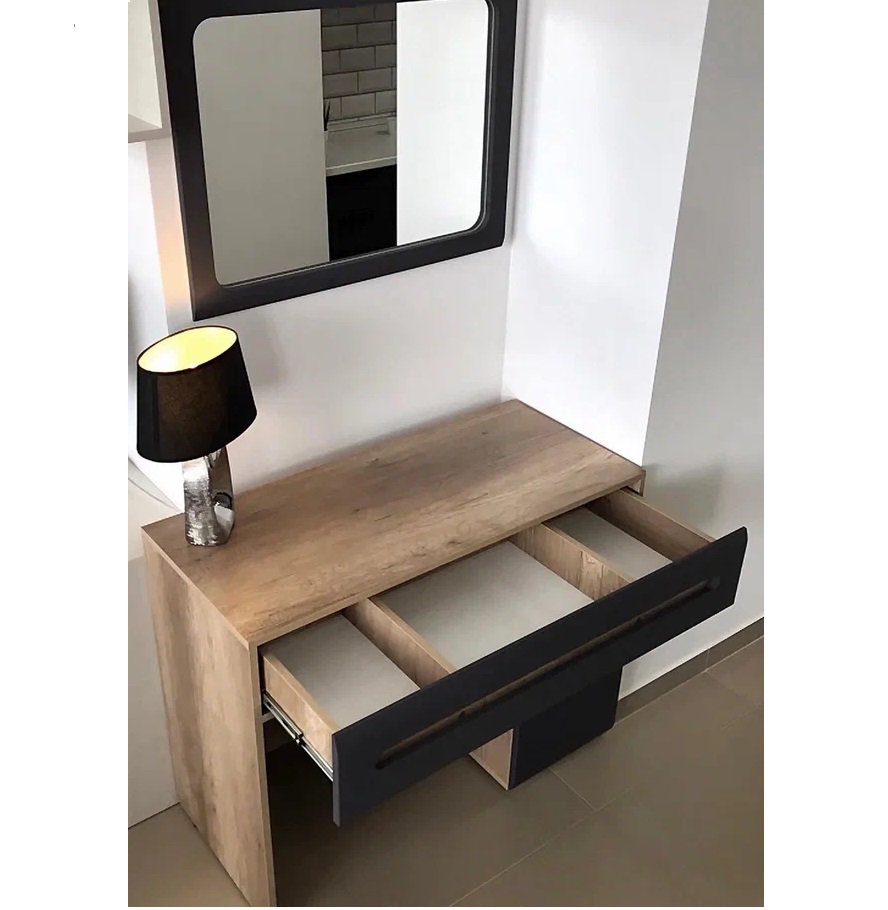 Туалетный стол с широким ящиком и двумя закрытыми нишами. Благодаря универсальной конструкции может использоваться не только в процессе нанесения макияжа, но и для работы или учебы, как письменный стол.