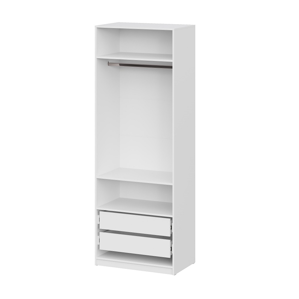 Шкаф оснащен вместительными полками, ящиками и вешалкой-штангой.