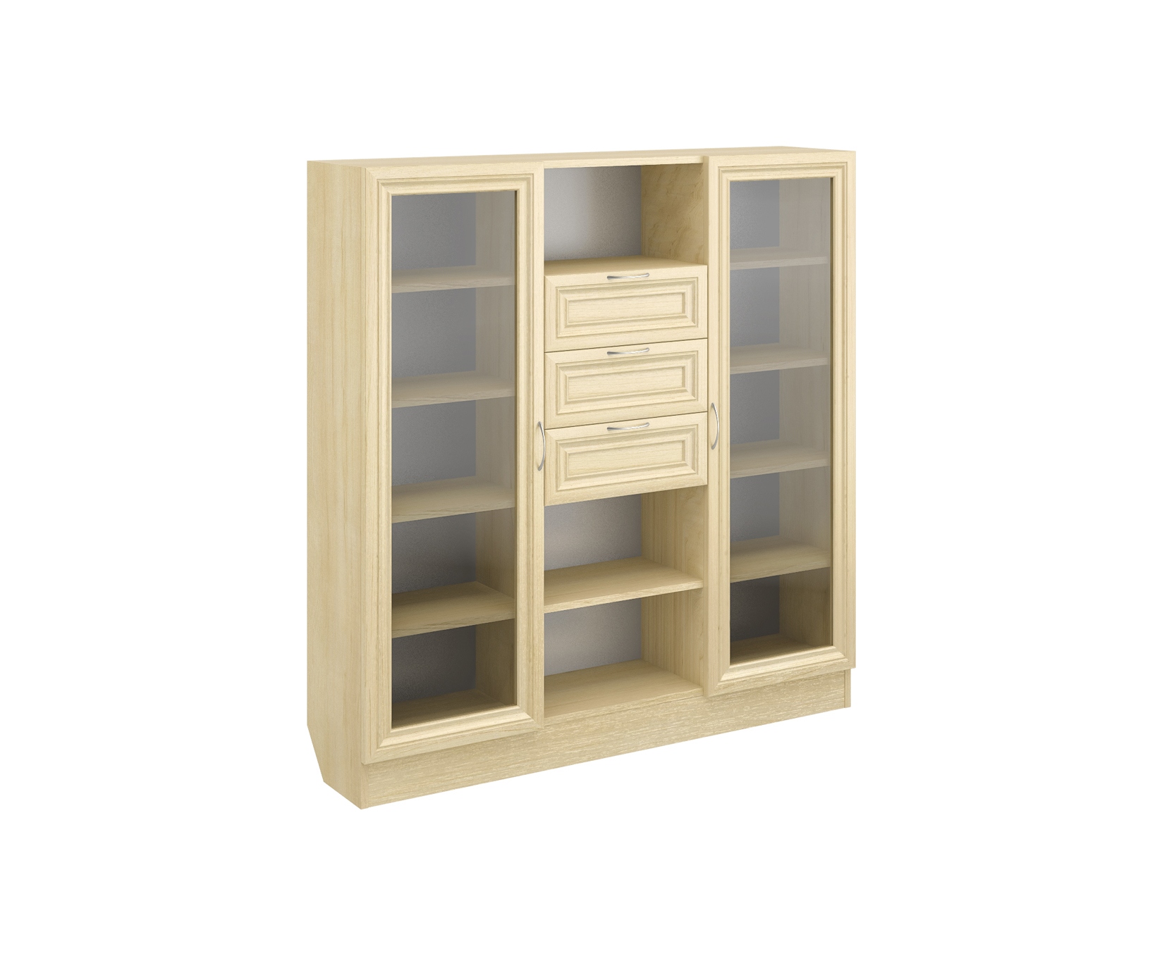 ШК-10 Изделие представляет собой универсальный высокий, книжный комод с застекленными секциями и выкатными ящиками. Корпус выполнен из Ламинированной ДСП высокого качества с насыщенным цветом. Наполнение комода представляет собой три вертикальных секции, средняя секция содержит три открытых ниши и три выкатных ящика. По бокам справа и слева расположены закрытые симметричные секции с распашными дверьми. В каждой такой секции по четыре полки. Фасады выполнены из материала МДФ.