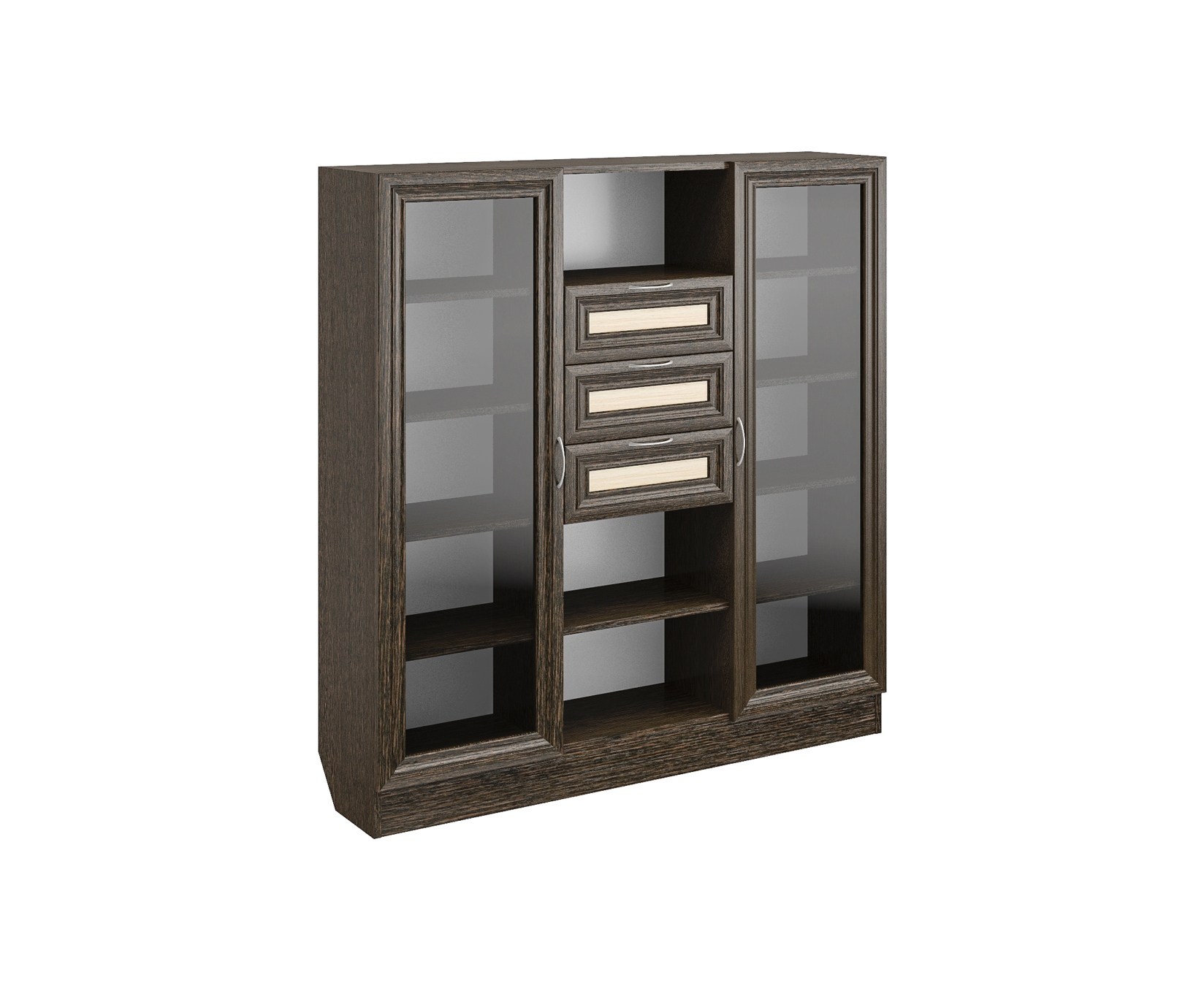 ШК-10 Изделие представляет собой универсальный высокий, книжный комод с застекленными секциями и выкатными ящиками. Корпус выполнен из Ламинированной ДСП высокого качества с насыщенным цветом. Наполнение комода представляет собой три вертикальных секции, средняя секция содержит три открытых ниши и три выкатных ящика. По бокам справа и слева расположены закрытые симметричные секции с распашными дверьми. В каждой такой секции по четыре полки. Фасады выполнены из материала МДФ.