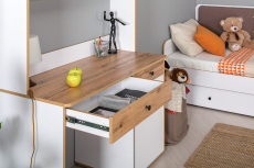Тумба стола имеет удобное распашное отделение с полкой внутри и выдвижным ящиком над ним на шариковых направляющих полного выдвижения.