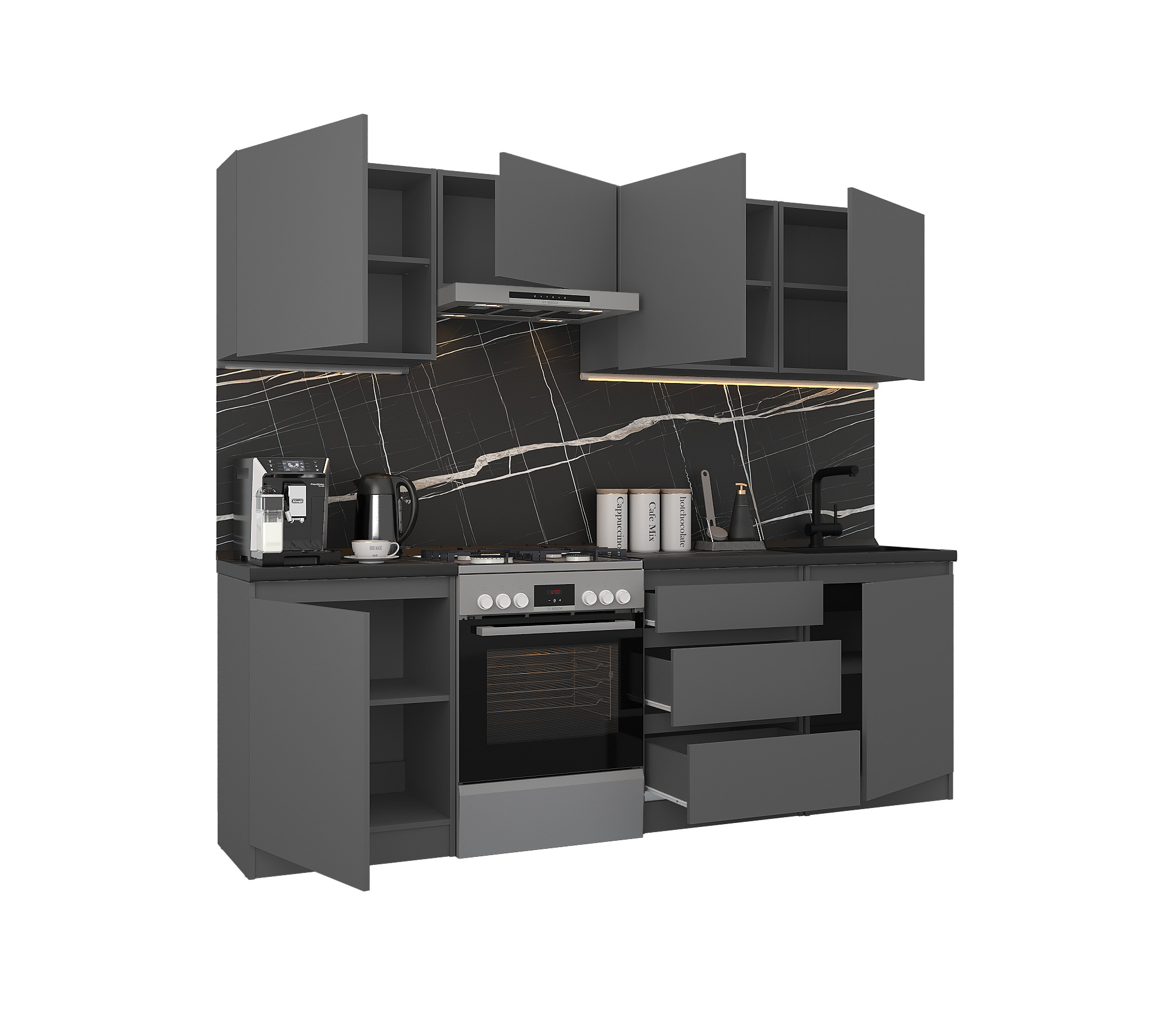 Обратите внимание, что столешница, стеновая панель, мойка и смеситель не входят в комплектацию кухни Леон и приобретаются отдельно. Это позволяет вам выбрать идеальные аксессуары и элементы для создания индивидуального дизайна вашей кухни.