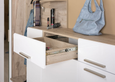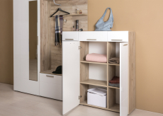 - Конструкция с 2-мя выдвижными ящиками вверху и двумя секциями с дверками для обуви внизу.