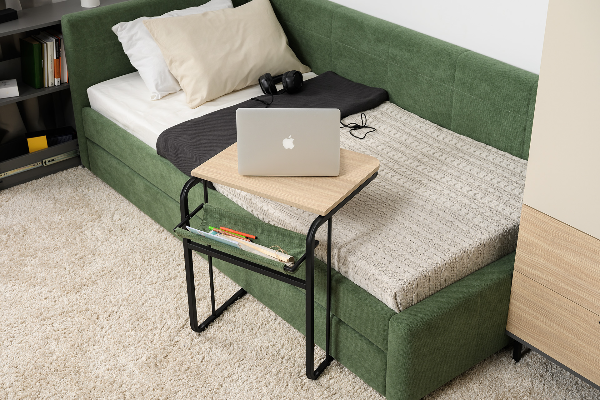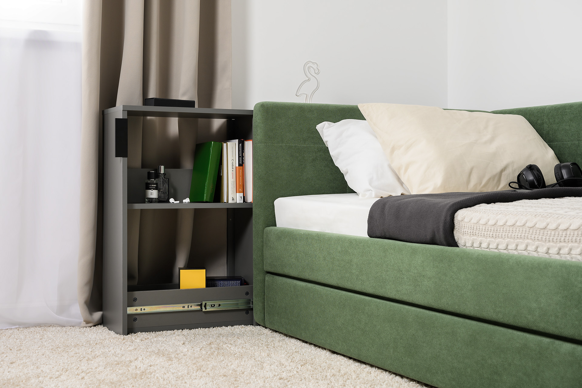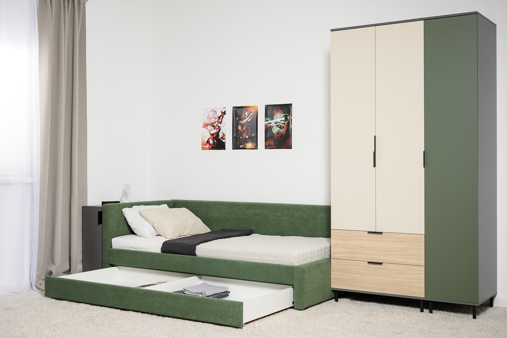 Односпальная кровать-тахта Марвел 90 с мгякой обивкой в дымчато-зеленом оттенке — прекрасное решение для современной и яркой комнаты для подростка или ребенка.