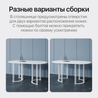 Подстолье, состоящее из двух ножек-полумесяцев, изготовлено из металла (высококачественная сталь) с устойчивой (двойной) порошковой окраской. Столешница выполнена из ЛДСП высокого качества Egger. Толщина столешницы - 25 мм.