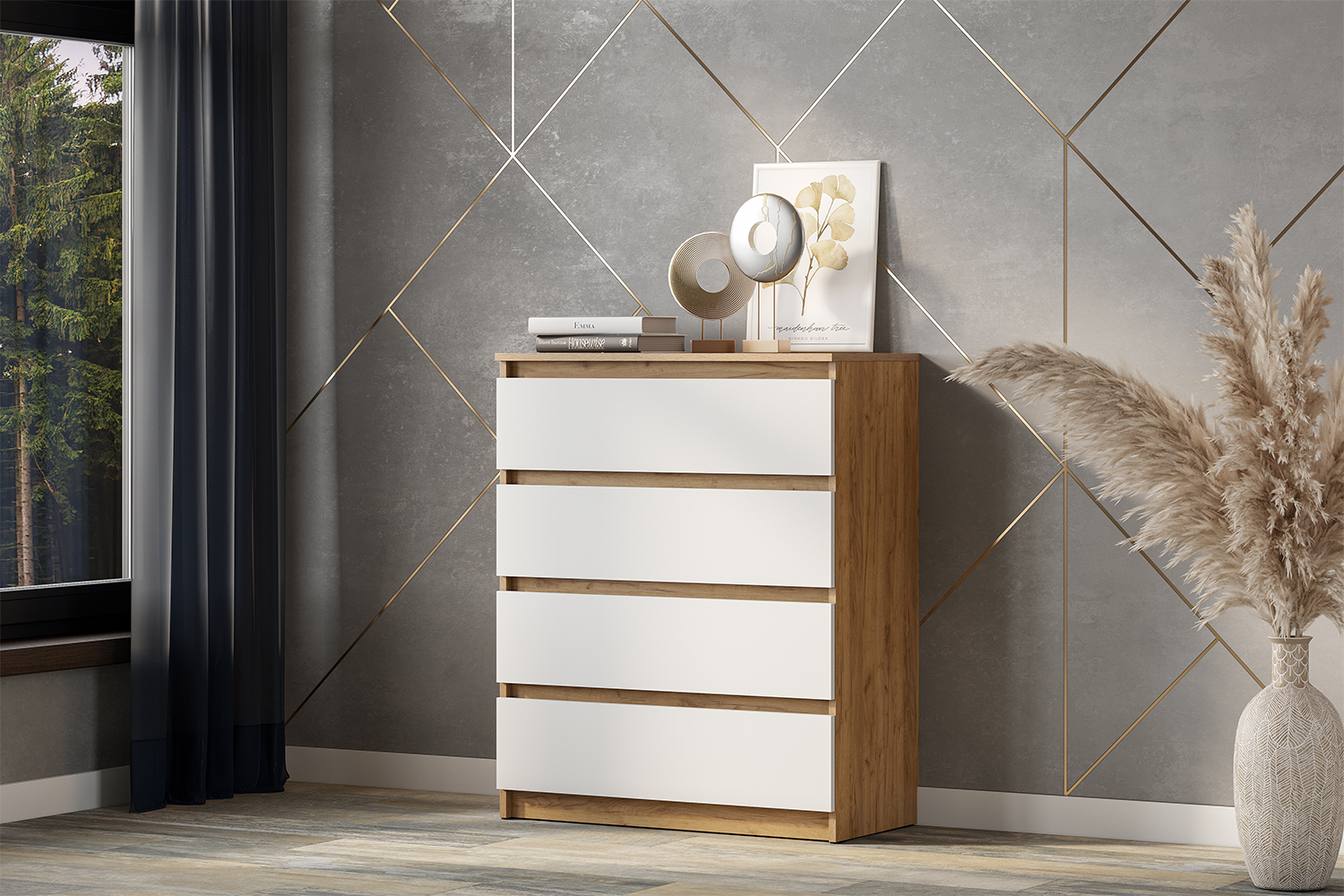 Комод с ящиками из модульной серии Денвер дополнит современный и сканди интерьер. Четыре вместительных ящика позволят организовать идеальное место хранения. Благодаря своим размерам, комод помещается в любую комнату, не занимая много места. Он добавит функциональности в ваш дом, а также поможет поддерживать порядок даже в офисе.