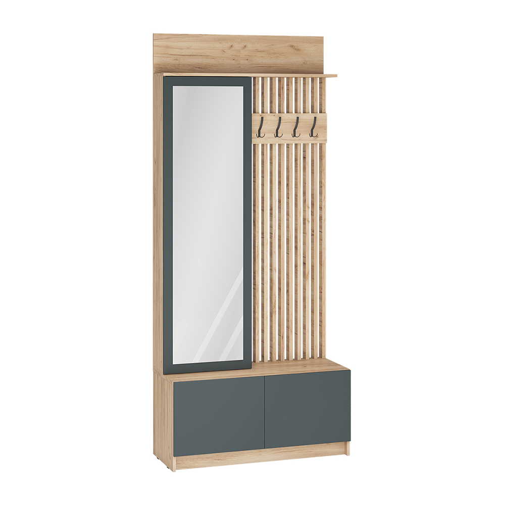 Вешалка Стоуби отлично подойдет для небольших прихожих. Данная модель выполнена в модном цветовом решении корпус: дуб крафт золотой, а фасады вы можете выбрать из двух цветов графит или белый глянец.