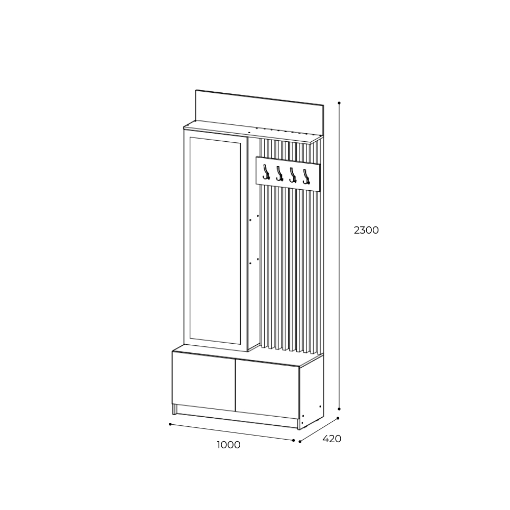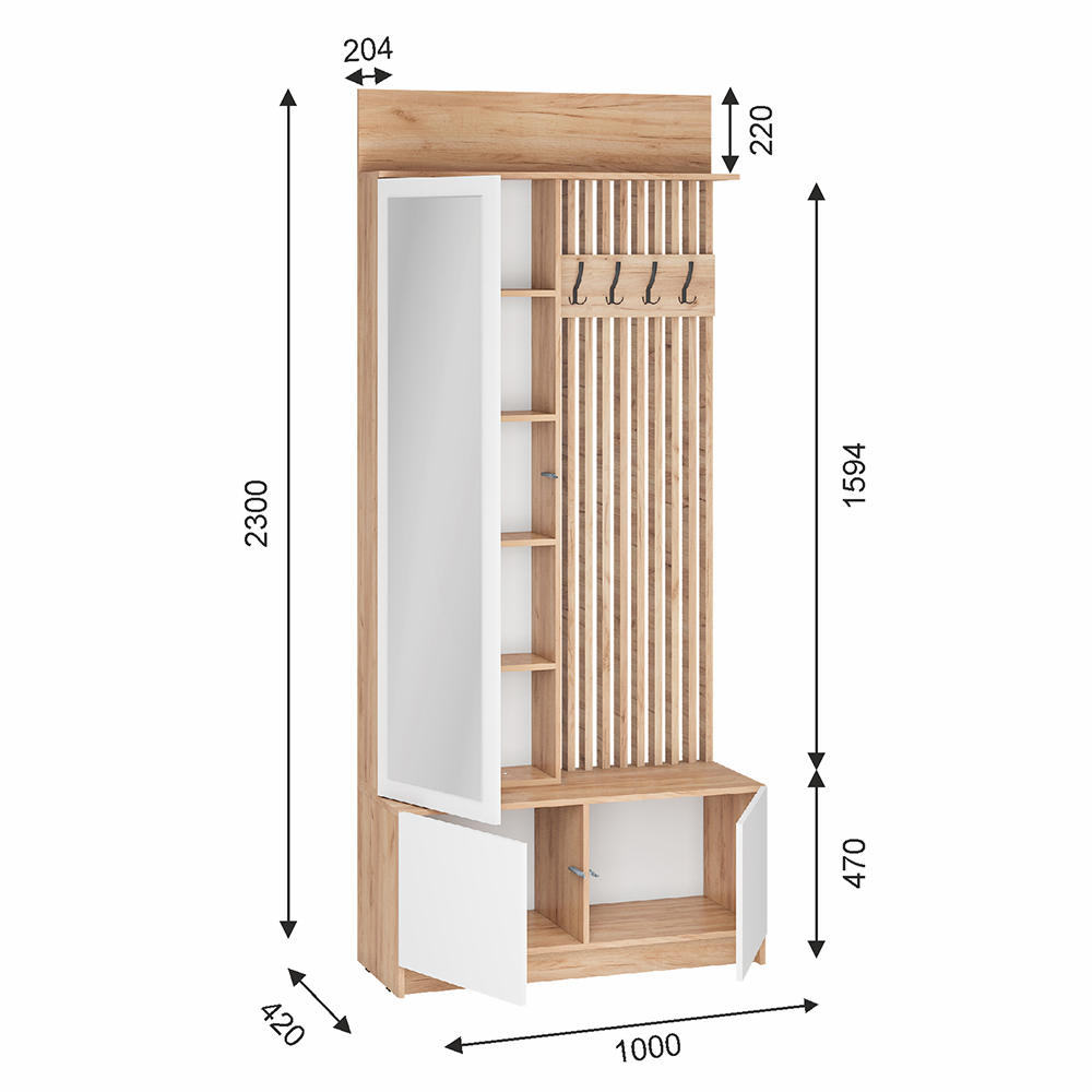 Вешалка состоит из широкой полки для головных уборов, четырех крючков, а за дверцей с зеркалом располагаются многочисленные полки, внизу модуля расположена секция для обуви.
