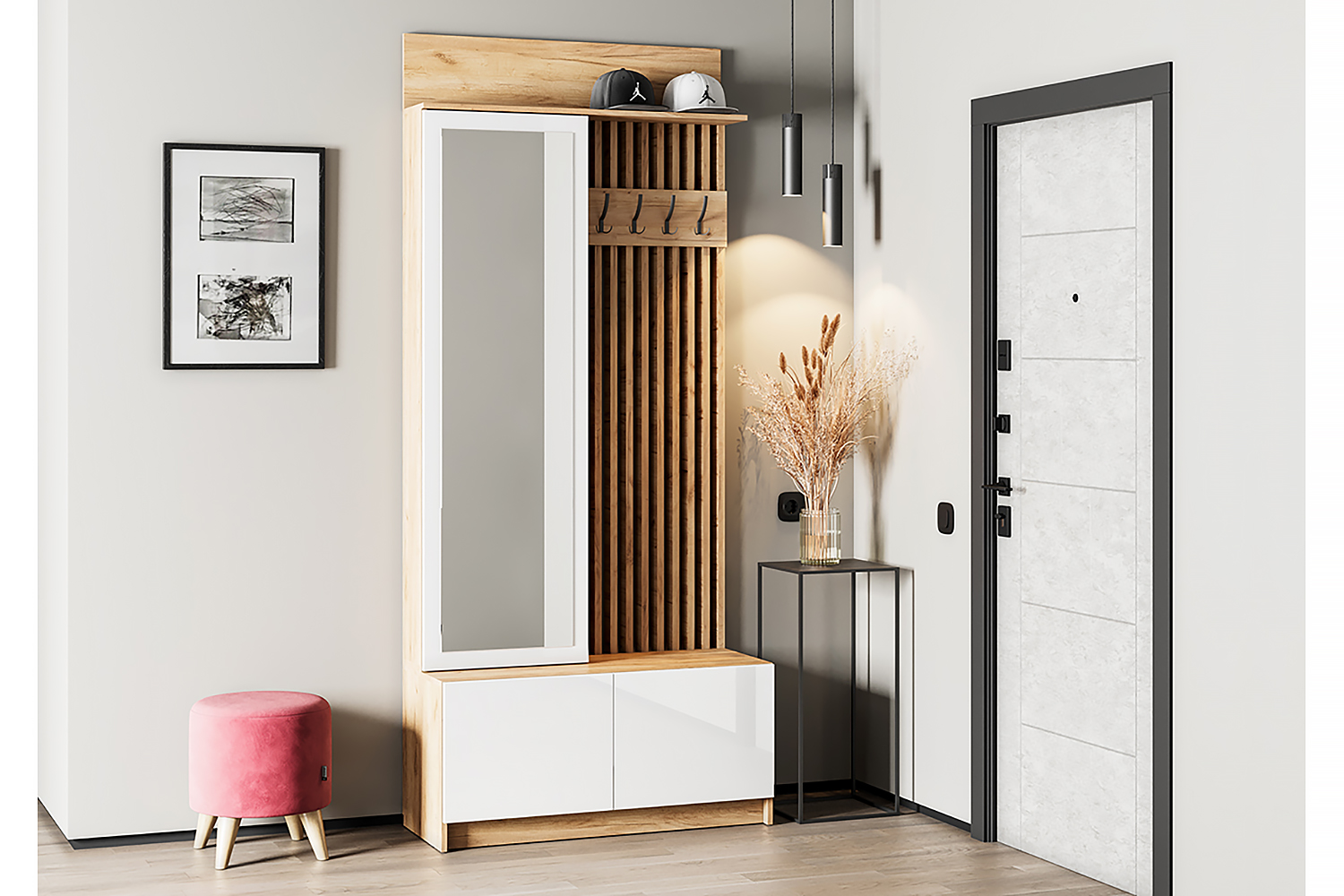 Вешалка Стоуби отлично подойдет для небольших прихожих. Данная модель выполнена в модном цветовом решении корпус: дуб крафт золотой, а фасады вы можете выбрать из двух цветов графит или белый глянец.