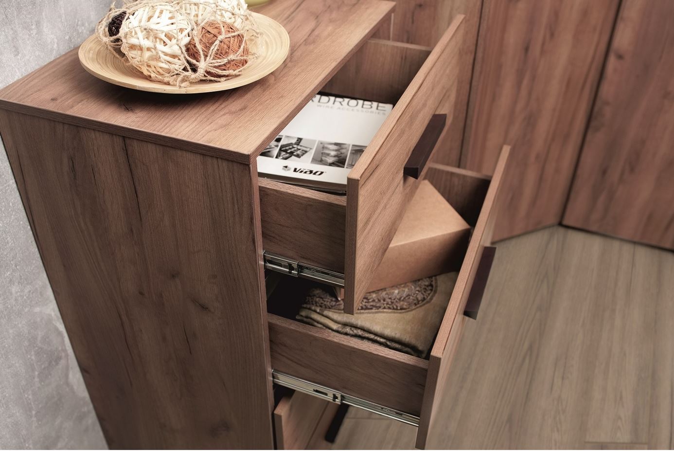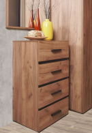 Для спальни отлично подойдет высокий комод Nature 45. Гладкие фасады ящиков в теплом декоре Дуб Табачный Craft с контрастными черными боковыми планками снизу делают его по-настоящему особенным. Четыре выдвижных ящика способны вместить все необходимое, а компактная конструкция сэкономит место в комнате. Ящики легко открываются благодаря направляющим полного выдвижения. Они быстро и легко устанавливаются при сборке комода. Регулируемые опоры компенсируют незначительные неровности пола.