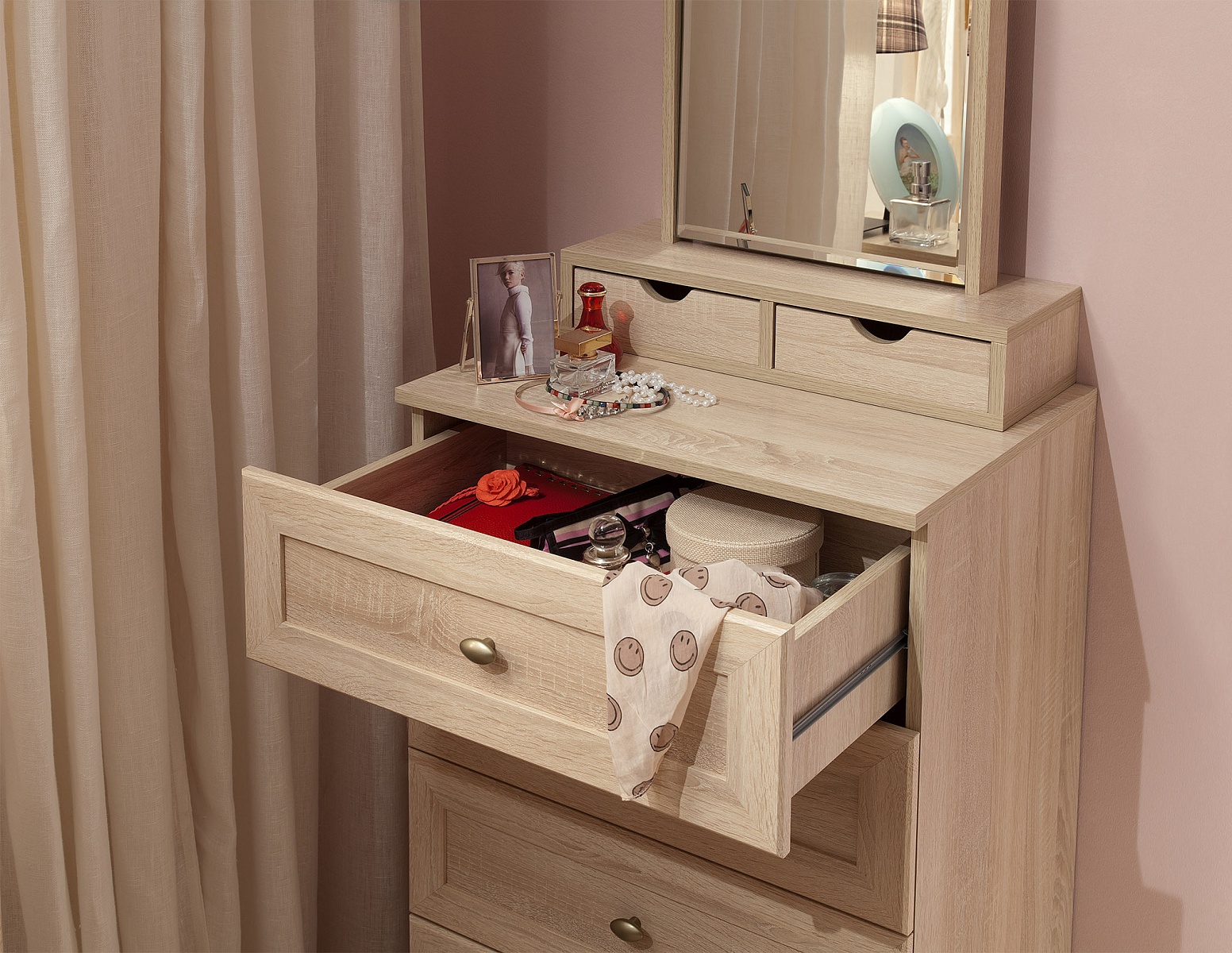 Высокий комод Sherlock 6 с пятью вместительными ящиками - незаменимый элемент мебели в спальне или гостиной. Модель комплектуется шариковым направляющими полного выдвижения, гарантирующими плавный и бесшумный ход. Габариты ящиков 54х35х14 см, максимальная нагрузка на каждый - 20 кг. Прекрасно сочетается с навесным зеркалом и трюмо из коллекции Sherlock.