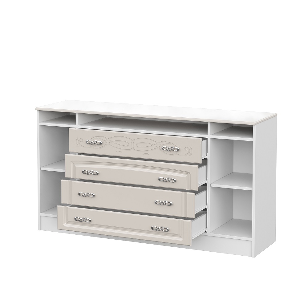 Широкий комод в классическом стиле, который будет гармонично вписываться в интерьер гостиной или спальни. Модуль имеет выкатные ящики, закрытые полки за фасадами, а также открытые полки под столешницей. Уточненные ручки выглядят дорого и украшают фрезерованные фасады из МДФ.