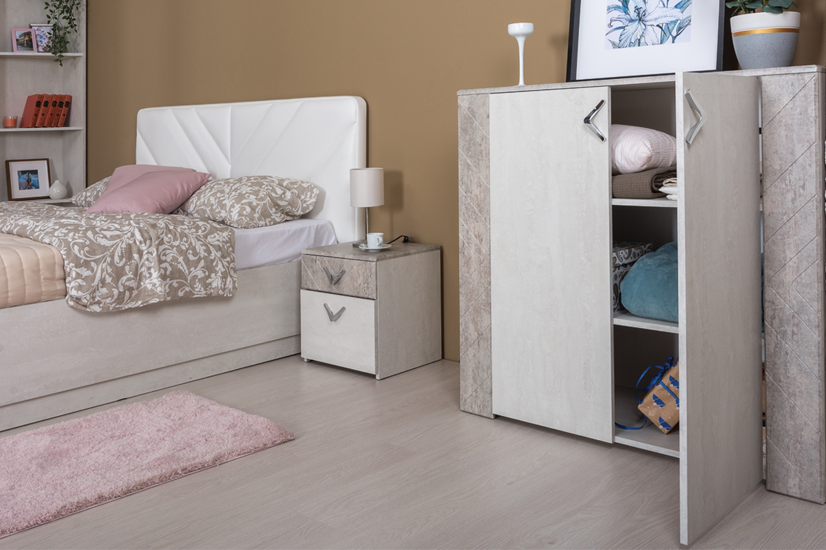 Комод «Амели» с глянцевыми фасадами цвета «шёлковый камень» и корпусом «бетон Чикаго беж» — это стильный и функциональный предмет мебели для вашей спальни.